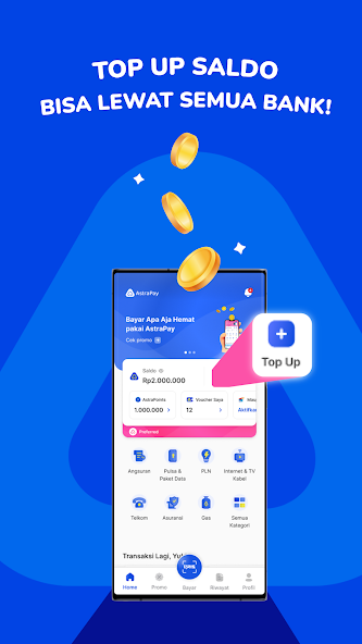 - Puede pagar/comprar crédito, paquetes de datos, pospago, cupones de juego, Telkom, Internet, TV por cable, PLN, PDAM, PGN, Pertagas, Donaciones y Zakat, Seguros y PBB desde casa usando AstraPay .