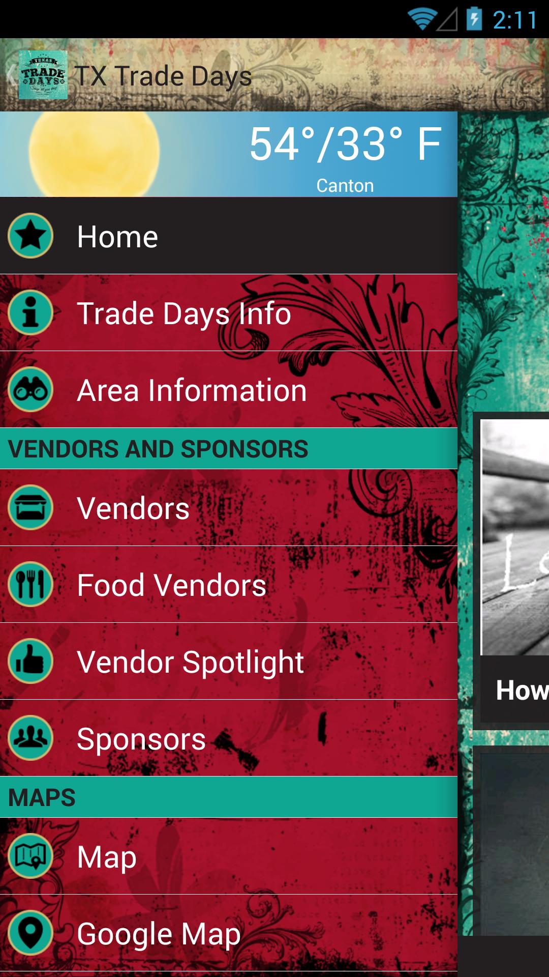Téléchargez cette application tôt et planifiez votre voyage sur l'un des quatre marchés des jours de commerce de l'État du Texas. Les premiers jours de commerce du premier lundi de Canton sont l'un des plus grands et des plus anciens. Fredericksburg Trade Days est au cœur du Texas Hill Country. Que vous soyez un acheteur sérieux ou que vous souhaitiez simplement sortir pour la journée, Texas Trade Days vous donneront des informations sur les vendeurs, le parking, les heures de fonctionnement et d'autres choses à faire dans la région. Planifiez votre voyage avant d'arriver en recherchant des vendeurs que vous souhaitez visiter, "préférés", puis vous pouvez les retirer lorsque vous arrivez à l'événement. Certaines des fonctionnalités de l'application incluent: