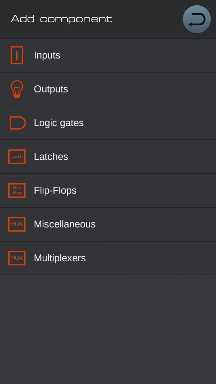 - Fonctionnement de récupération (si l'application se ferme avant de réussir à enregistrer votre circuit en raison d'un appel téléphonique ou par accident, Logic Simulator Pro enregistrera automatiquement une copie de votre progression actuelle. Cette copie peut être facilement accessible via l'interface du circuit ouvert)