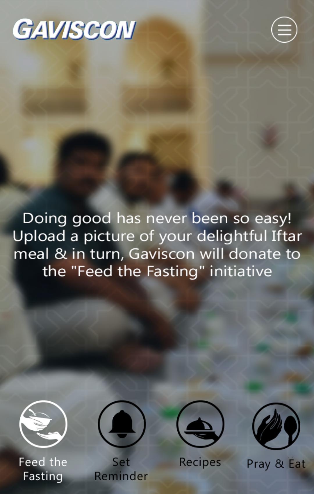 Gaviscon est une application interactive et conviviale qui définit vos alarmes de prière du Ramadan et présente une affaire gastronomique avec vos recettes préférées. Avec l'initiative «Feed the Fasting», vous pouvez faire un don pendant le mois sacré du Ramadan en téléchargeant simplement une image! Téléchargez l'application pour en savoir plus.