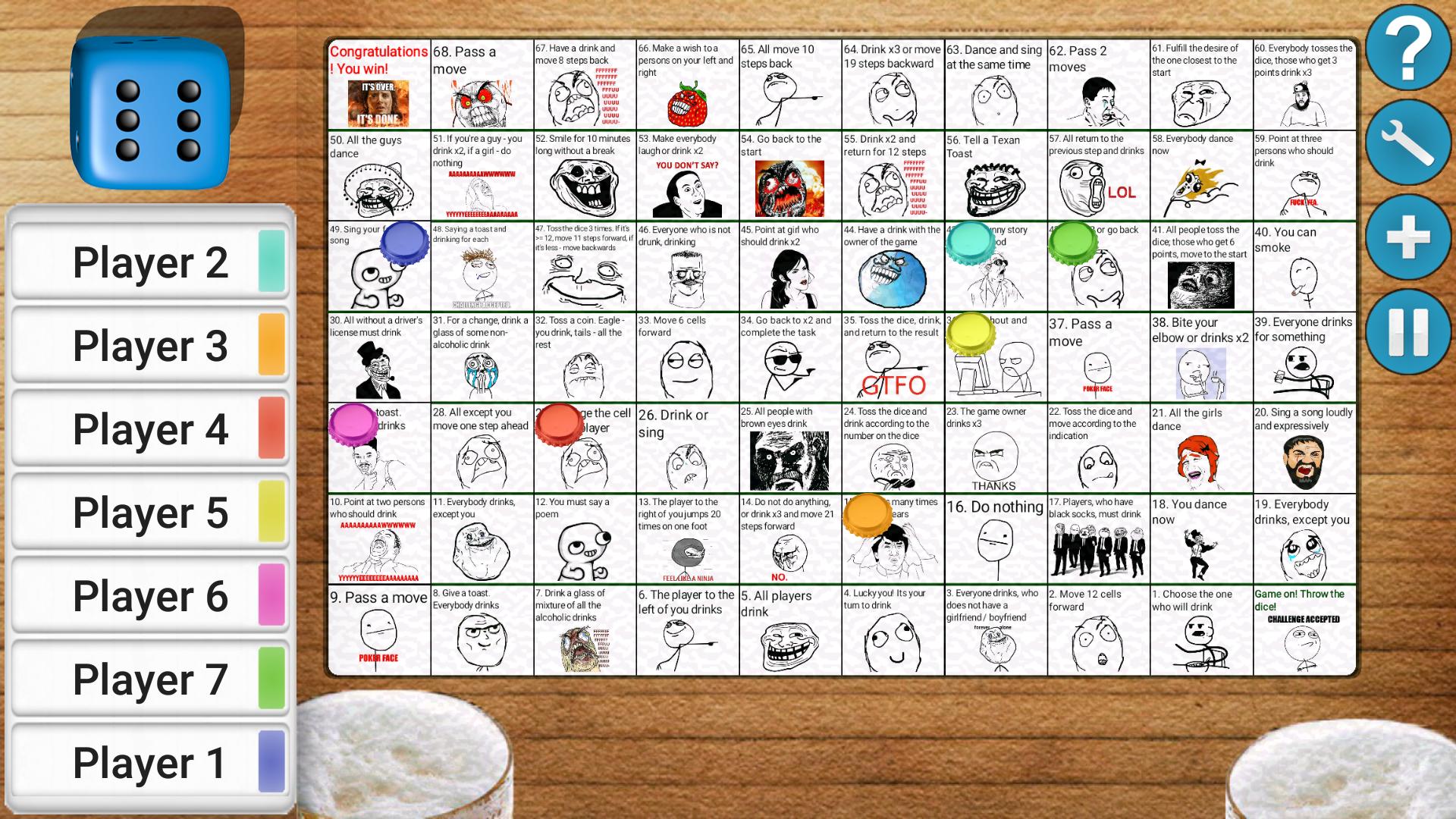 Les joueurs jettent à tour de rôle les dés et se déplacent autour de la carte, où chaque cellule représente un défi divertissant. Une fois à l'intérieur de la cellule, vous devez terminer la tâche correspondante! Une soirée amusante est garantie)