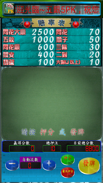 Five Silver 5PK donne au joueur cinq cartes, qui sont spécifiées par les joueurs quelques réservations, le reste du remplacement, après avoir remplacé la carte en ligne avec le type de carte de table de paiement peut marquer.