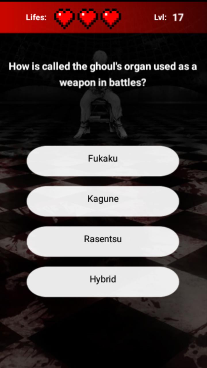 Ghoul Quiz est un hommage à l'anime Tokyo Ghoul et ce n'est pas une application officielle.