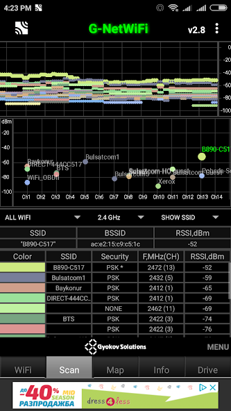 G-NetWiFi adalah Monitor Jaringan WiFi dan alat uji drive untuk perangkat OS Android. Ini memungkinkan pemantauan dan pencatatan parameter jaringan WiFi tanpa menggunakan peralatan khusus. Ini alat dan itu mainan. Dapat digunakan oleh para profesional untuk mendapatkan wawasan yang lebih baik tentang jaringan atau oleh penggemar radio untuk mempelajari lebih lanjut tentang jaringan WiFi.