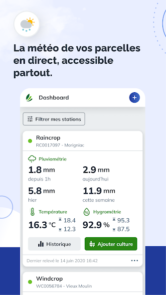 Sebagai aplikasi cuaca yang paling dapat diandalkan dan akurat untuk petani, Sencrop mengandalkan lebih dari 35.000 stasiun cuaca presisi yang sangat lokal di seluruh Eropa untuk membantu petani dalam membuat keputusan tepat waktu setiap hari. Aplikasi cuaca ultra-lokal kami menawarkan masa percobaan 14 hari gratis.