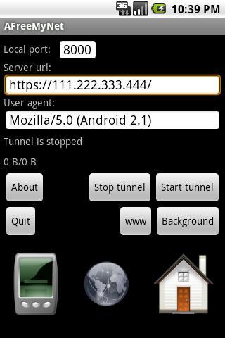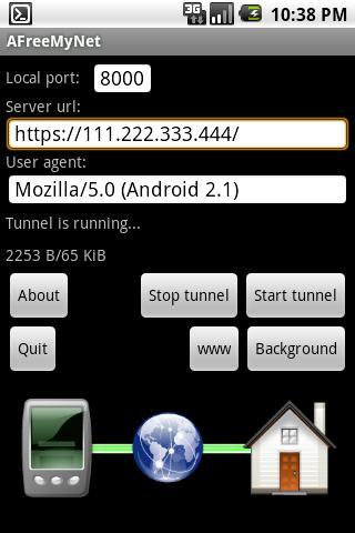 AFreeMyNet adalah bagian Android dari JFreemynet. Secara keseluruhan mereka memungkinkan Anda untuk mengatur terowongan HTTP (s) antara perangkat Android Anda dan komputer rumah Anda. Di dalam terowongan ini Anda dapat menggunakan protokol yang Anda inginkan (ssh, ...)