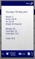Informasi shift Anda akan disimpan dalam database, bersama dengan statistik setiap minggu (hari dan jam kerja, tanggal, waktu, uang yang diperoleh, opsi untuk tips dan sejumlah dari keduanya).