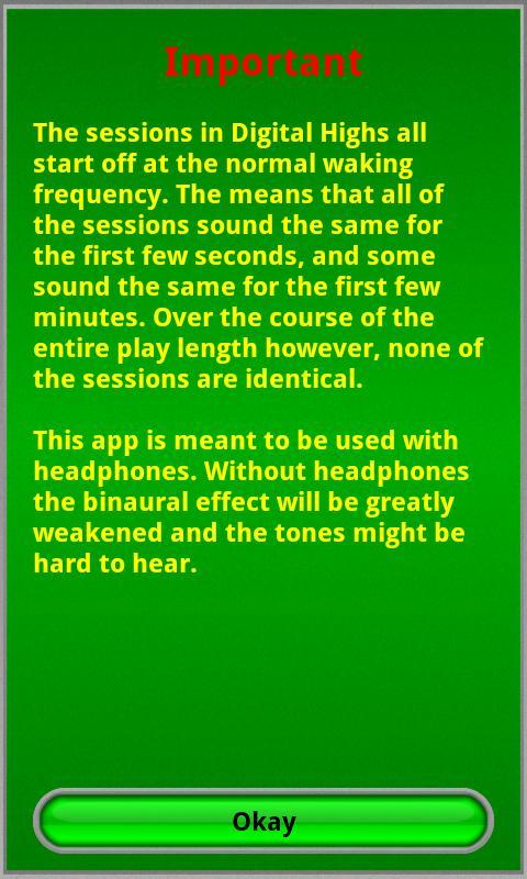 Digital Highs hanya berisi program binaural dengan trek backing noise merah muda. Ini menghemat ratusan megabyte ruang pada perangkat Android Anda dibandingkan dengan pemain berbasis MP3 dengan musik trippy di latar belakang. Bandingkan dengan i-doser.