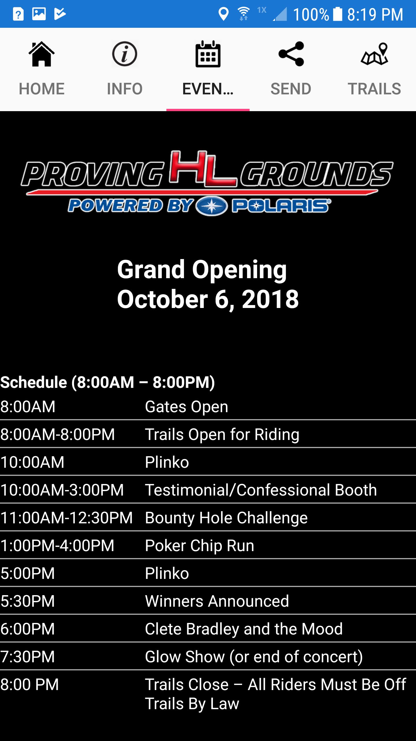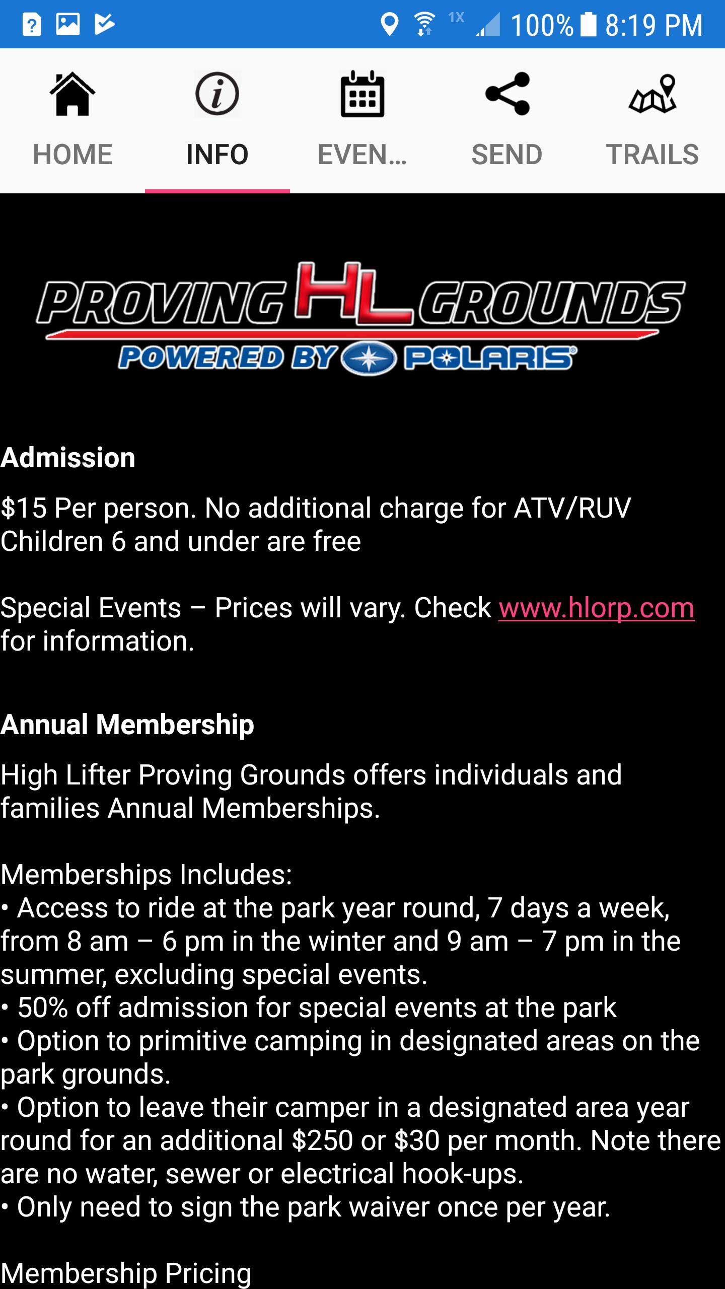 Aplikasi ini dibuat untuk HL Proving Grounds yang ditenagai oleh Polaris. Taman ini dirancang untuk pengendara ATV dan UTV dari segala usia. Apakah Anda seorang pengendara lumpur berpengalaman yang mencari lubang lumpur terdalam dan paling lengket atau pemilik ATV baru yang ingin menguji jalan setapak, kami memiliki sesuatu untuk semua orang. Berlokasi nyaman di luar Shreveport di Paroki Caddo Barat, Louisiana, HL Proving Grounds Didukung oleh Polaris adalah taman yang sempurna untuk menghabiskan hari di luar mengendarai teman dan keluarga tanpa harus bepergian selama berjam -jam untuk sampai ke sana.