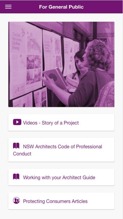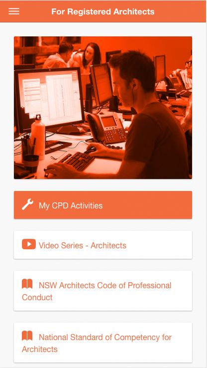 Arsitek terdaftar di NSW dapat merekam kegiatan pengembangan profesional berkelanjutan (CPD) mereka secara online. Arsitek juga dapat mengakses sumber daya yang relevan, publikasi, dan menonton video seperti kode perilaku profesional arsitek NSW.