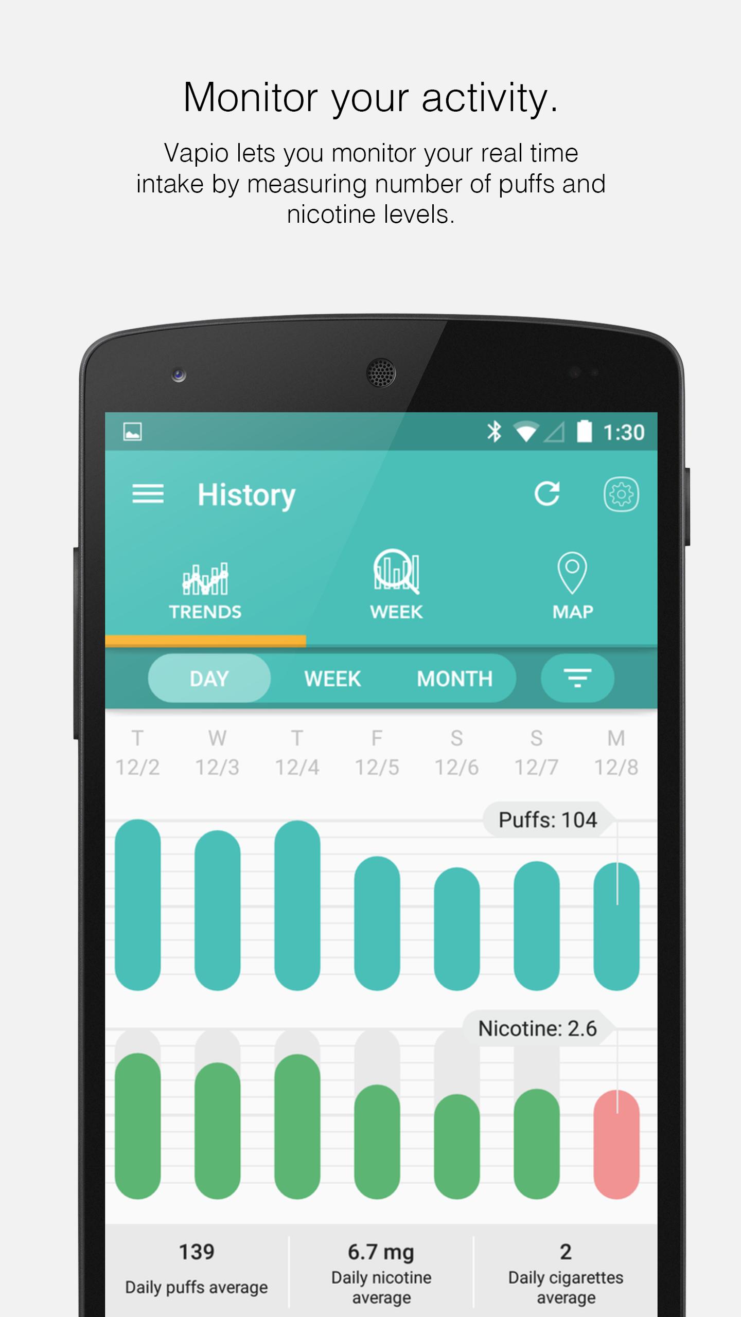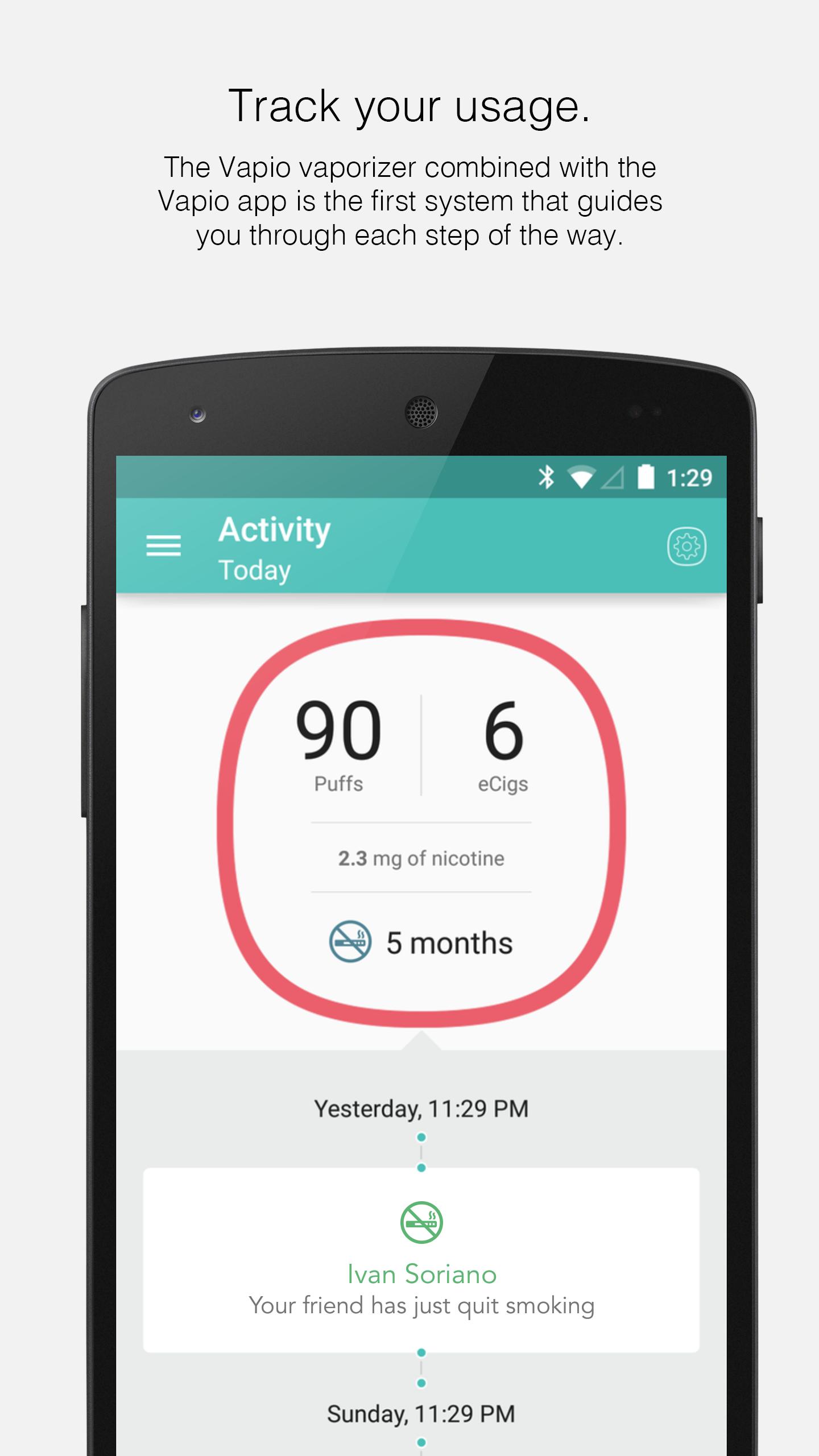 Tidak seperti vaporizer dasar, Vapio memungkinkan Anda memantau asupan waktu nyata Anda dengan mengukur jumlah puff dan tingkat nikotin. Ini menunjukkan seberapa baik Anda melakukan berkat laporan yang mendalam dan pemberitahuan yang disesuaikan. Aplikasi Vapio memberi tahu Anda di mana Anda juga paling banyak vape.