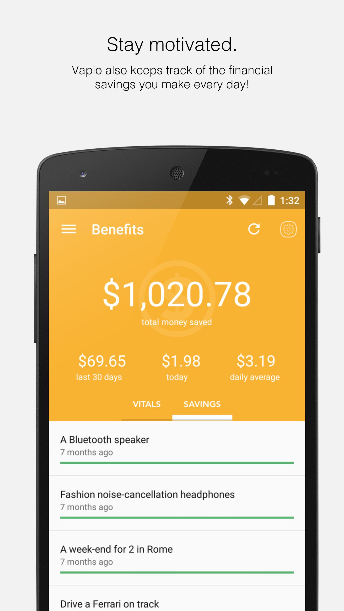 Untuk membuat Anda tetap termotivasi, Vapio melacak penghematan finansial yang Anda buat setiap hari! Untuk pertama kalinya, Anda dapat secara langsung menuai manfaat dari upaya Anda.