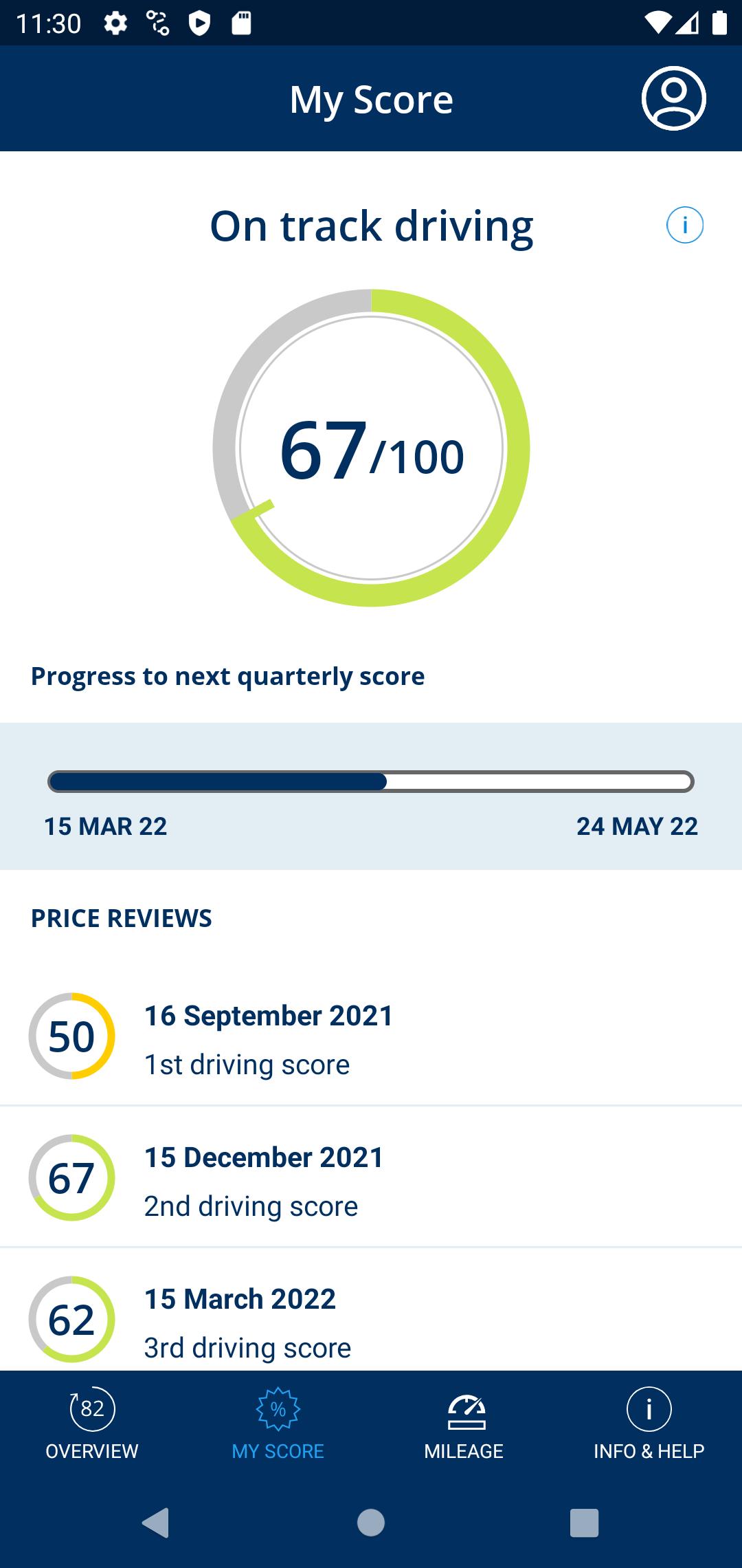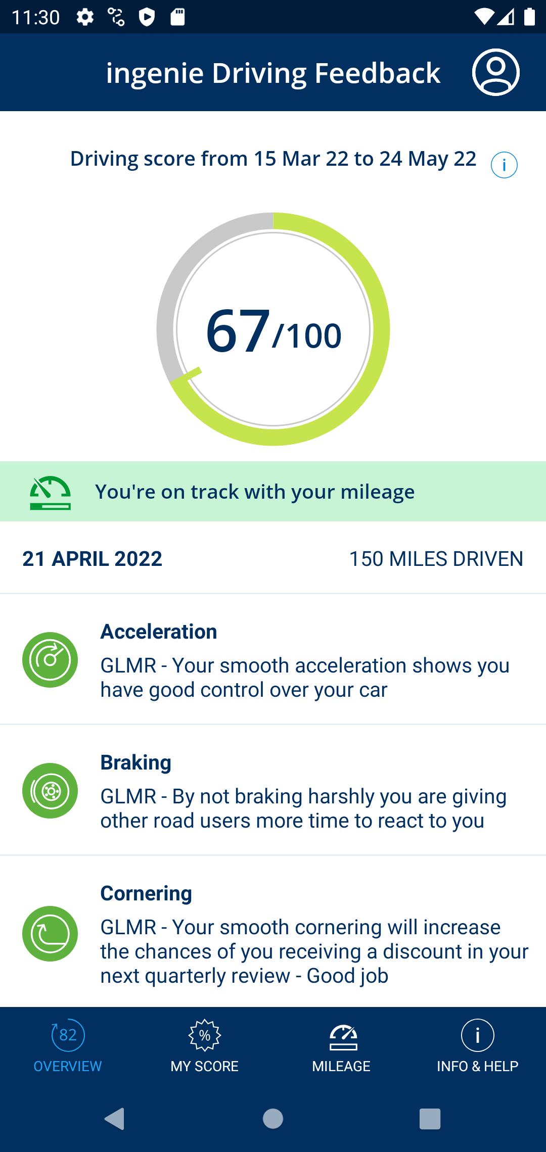 Setiap 10 hari Anda akan mendapatkan satu set pesan umpan balik mengemudi bersama dengan skor dari 100 berdasarkan gaya mengemudi Anda. Semakin baik skor Anda, semakin besar diskon Anda saat pembaruan! Tetap di jalur tempat Anda mengemudi dengan baik dan gunakan nasihat mengemudi praktis ingenie untuk membantu Anda meningkatkan skor Anda.