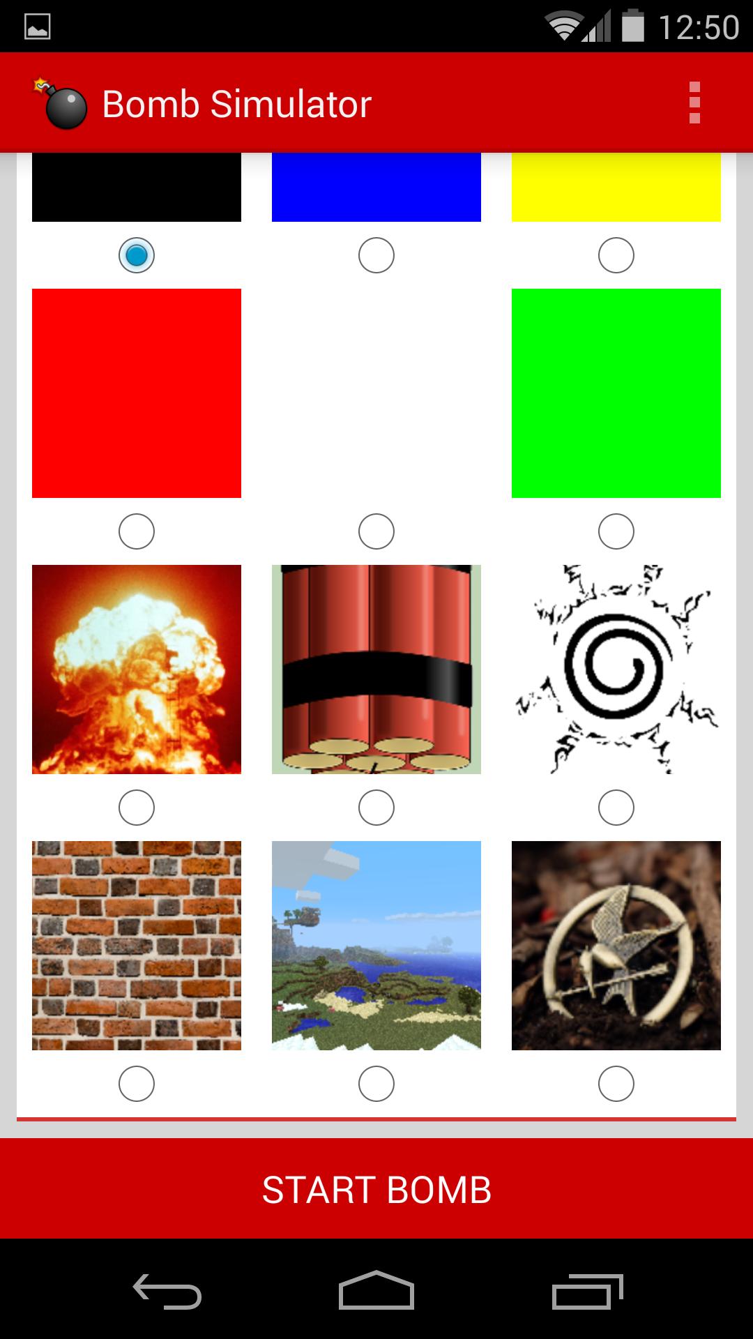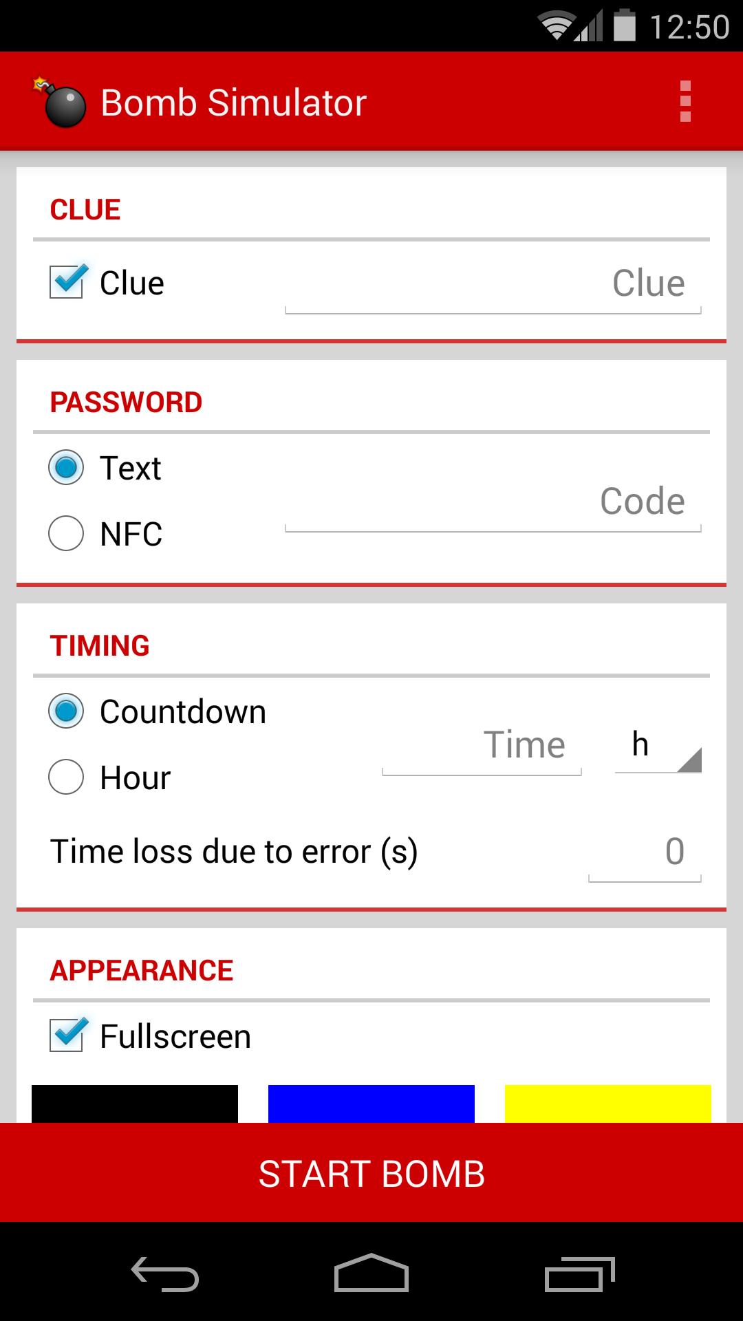 Anda dapat mengatur jumlah waktu di mana bom akan berbunyi, atau memutuskan bahwa lebih baik berbunyi pada jam tetap. Kata sandi dan petunjuk dapat ditentukan juga, sehingga Anda dapat mengusulkan teka -teki kepada teman. Juga, Anda dapat mengubah latar belakang warna atau gambar apa pun di bagian penampilan!