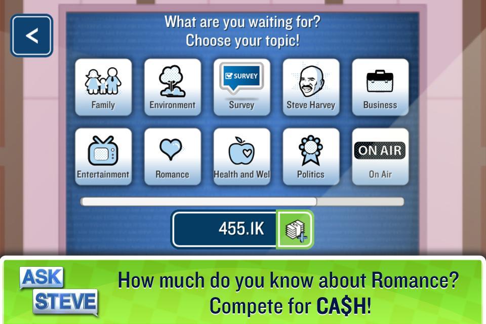 Dari studio ke ponsel Anda, tanyakan pada Steve aplikasi sekarang memberi Anda kesempatan untuk menjawab dan mengajukan pertanyaan gila tentang dilema terbesar dalam hidup. Tanya Steve adalah segmen favorit semua orang di acara bincang -bincang siang hari Steve Harvey. Anda menyukai pertunjukan sekarang saatnya bermain game.