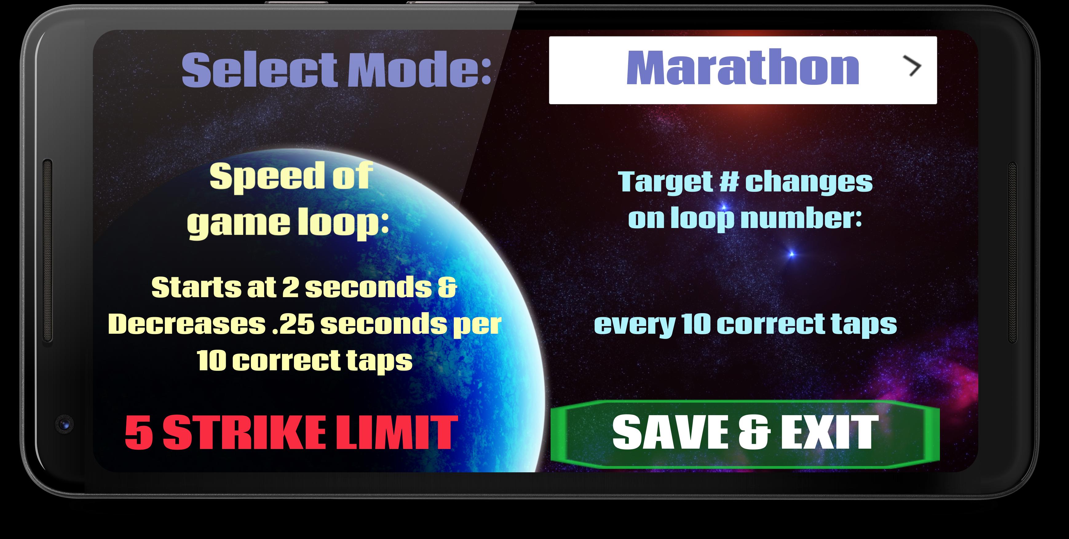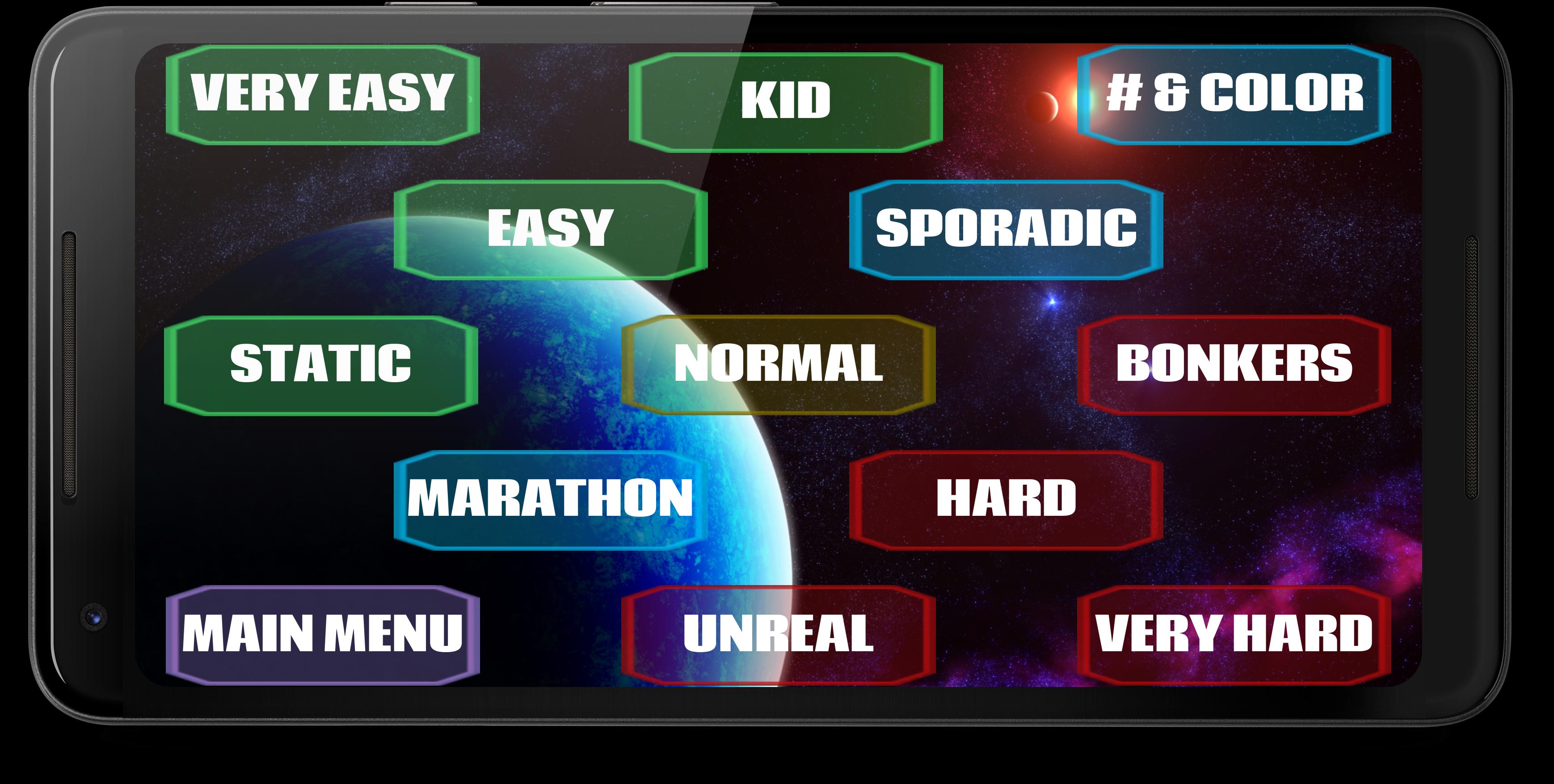 Pemain dari semua jenis dapat menikmati permainan ini, dari Mode Kid (di mana anak selalu menang) ke Mode Unreal di mana tidak ada kesalahan yang diizinkan dan grid bermain berubah setiap detik! Satu mode unik adalah maraton, di mana angka target berubah dan kecepatan meningkat seperempat detik setiap 10 ketukan yang benar! Mode menyenangkan lainnya adalah gila, di mana nomor target untuk menekan perubahan setiap iterasi grid play! Mode lain termasuk nomor target berubah secara acak dan banyak lagi. (Detail masing -masing mode dapat dilihat dan diubah dalam pengaturan).
