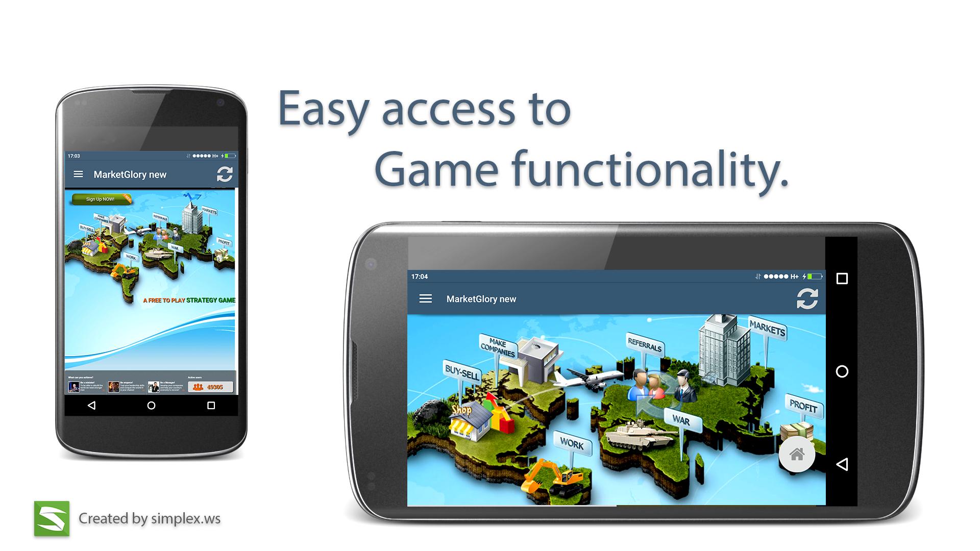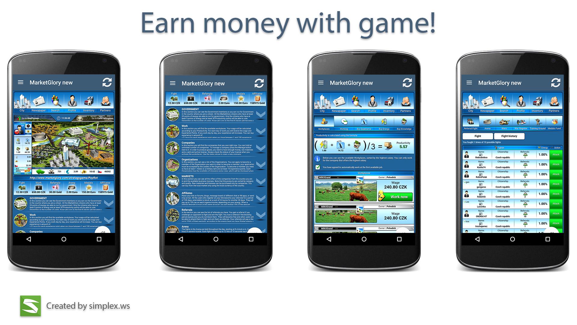 Marketglory adalah permainan browser online massal di mana semua virtual Currecy dapat ditukar dengan uang sungguhan. Ini adalah simulator ekonomi, politik, sosial dan militer di mana Anda dapat menggunakan mata uang lokal Anda untuk keuntungan Anda. Setiap pemain dari komunitas Marketglory memiliki kesempatan untuk: bekerja, mendirikan perusahaan, mencalonkan diri untuk pemerintah, merekomendasikan rujukan, mendapatkan peringkat militer dan membangun organisasi mereka sendiri.