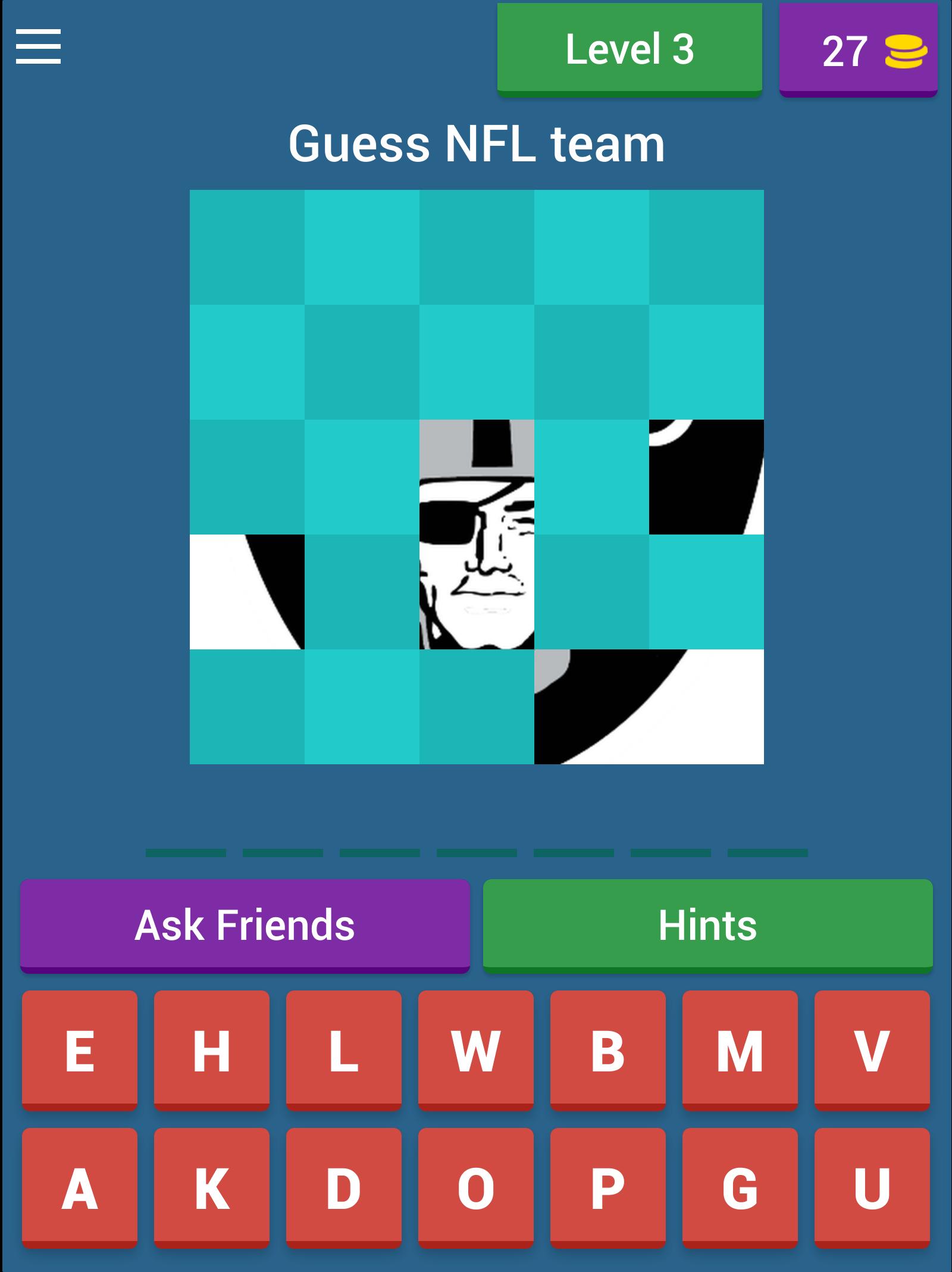 Guess NFL menggunakan gambar tersembunyi sebagai petunjuk. Anda harus menjawab pertanyaan untuk melewati setiap level dengan menemukan huruf yang tepat di ruang yang tersedia yang merupakan nama NFL Things. Bisakah Anda menemukan semua jawaban? Jika Anda tidak dapat mengenali logo, jangan khawatir! Anda memiliki koin sebagai kredit untuk mendapatkan petunjuk bahkan menjawab pertanyaan. Setiap Anda lulus level, Anda akan mendapatkan lebih banyak koin. Ubin yang lebih rendah yang Anda buka, Anda akan mendapatkan lebih banyak koin, dan lebih banyak ubin yang Anda buka, Anda akan mendapatkan lebih sedikit koin. Dengan demikian, Anda akan memiliki strategi untuk lulus semua tingkatan. Untungnya, jika Anda kurang koin, Anda bisa mendapatkan yang lain dengan berbagi di Facebook atau menonton video. Game ini berisi 48 level saat Anda mengunduhnya dari toko dan lebih banyak level dapat diunduh dalam permainan. Apa yang Anda tunggu? Buktikan pengetahuan olahraga Anda sebagai penggemar American Football NFL dengan memainkan kuis NFL ini. Semoga beruntung! Bersulang!