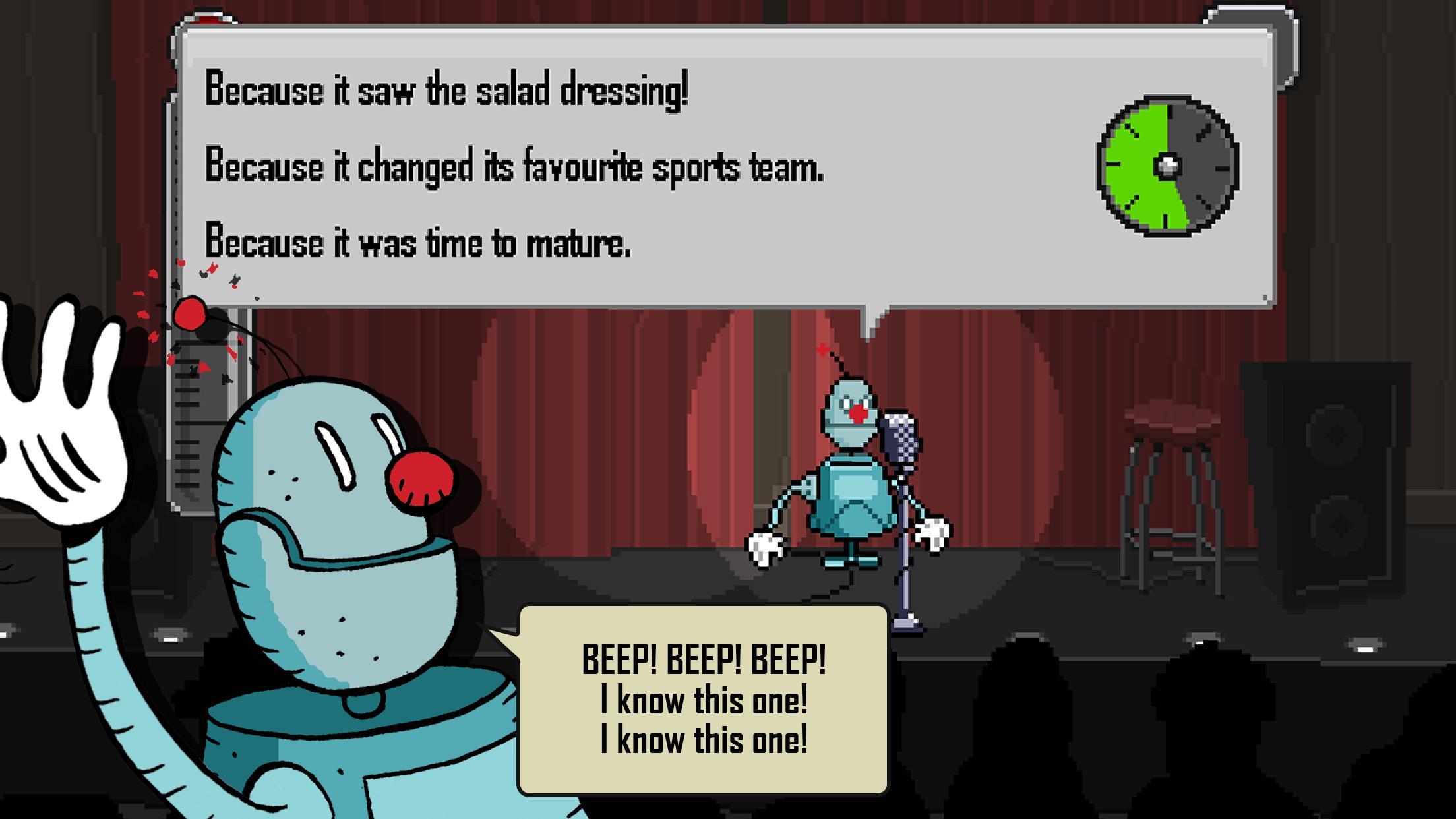 Clown Botは探偵事件の相棒であり、彼自身の自由な時間に、GAFバーでいくつかの余分なチェージの冗談を言っています。ジョークは、非常に面白いものから政治的に間違っているものから、かわいいものから本当にひどいものまでありますが、間違っていることから正しいことを知ることのできないロボットには何でもあります。