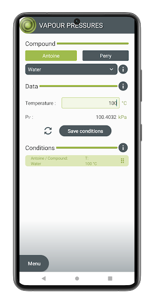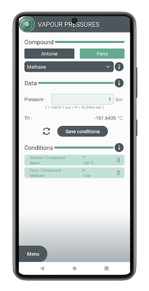 Vapour Pressures Vapour Pressures 과 비등점을 계산하도록 설계된 앱입니다. 두 개의 큰 데이터베이스가 있으며 많은 수의 압력 및 온도 장치를 처리합니다.