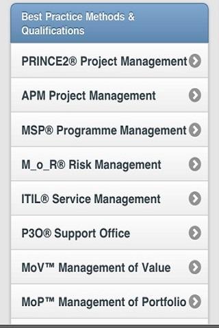 이는 Prince2 프로젝트 관리, MSP 프로그램 관리, MSP 프로그램 관리, M_O_R 위험 관리, APM 프로젝트 관리, P3O 지원 사무소, MOV 관리, 포트폴리오의 MOP 관리, 민첩한 프로젝트 관리, 민첩한 DSDM 프레임 워크 등과 같은 프로젝트, 프로그램 및 위험 관리 방법론에 대한 모바일 학습 리소스입니다.