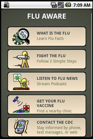 Flu Aware 또한 독감에 관한 추가 정보 및 서비스를 찾는 자원 역할을합니다. CDC에서 바로 최신 팟 캐스트 또는 문자 메시지 업데이트를받지 못하게됩니다.