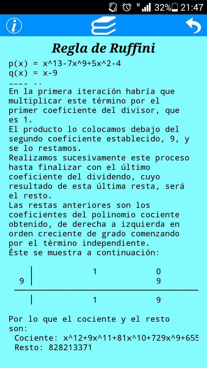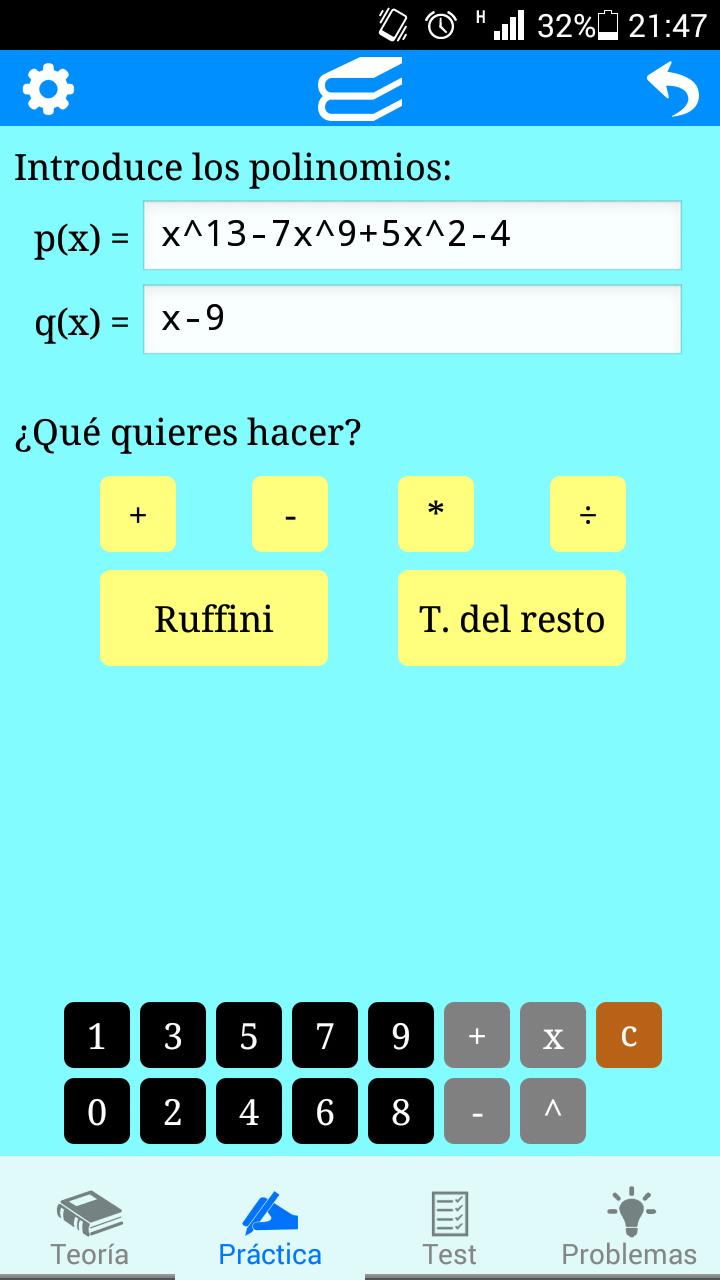 - 실습 : Polinomios 으로 기본 작업을 해결하고, 루피 니의 규칙을 통한 이들의 분해, 나머지 정리의 해석을 허용합니다.