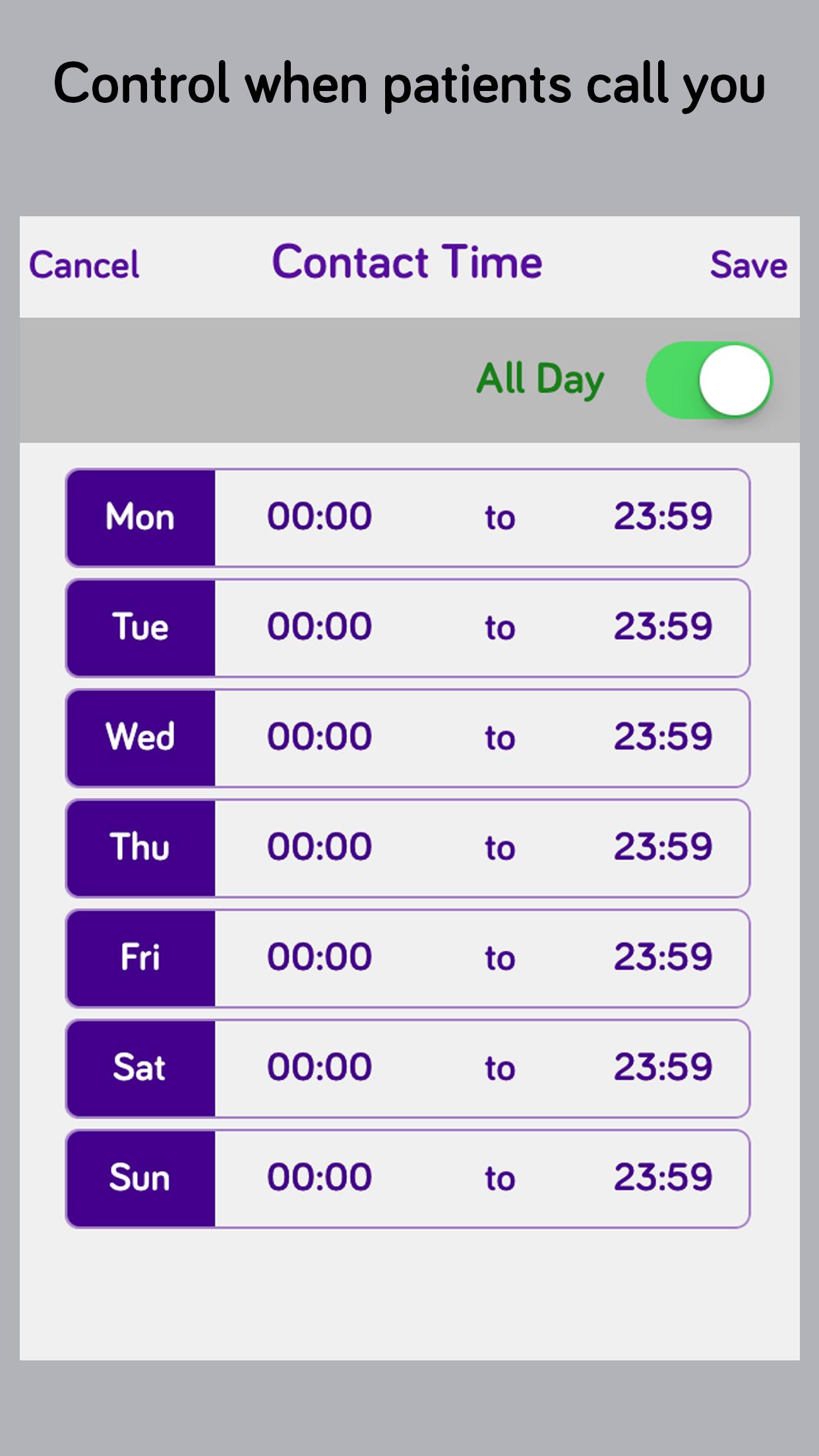 - Set Contact time. And control when you are busy and when your patients can call you.