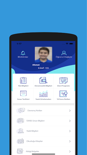 Это система, используемая всеми родителями детей в формальном образовании в Турции. Информация о экзаменах и проекте родителей и информация о расписании, информации о посещаемости, транспортных операциях, информация о размещении и экзаменах, школьные объявления, такие как книги, которые он прочитал через информационную систему, способны отслеживать в режиме реального времени.