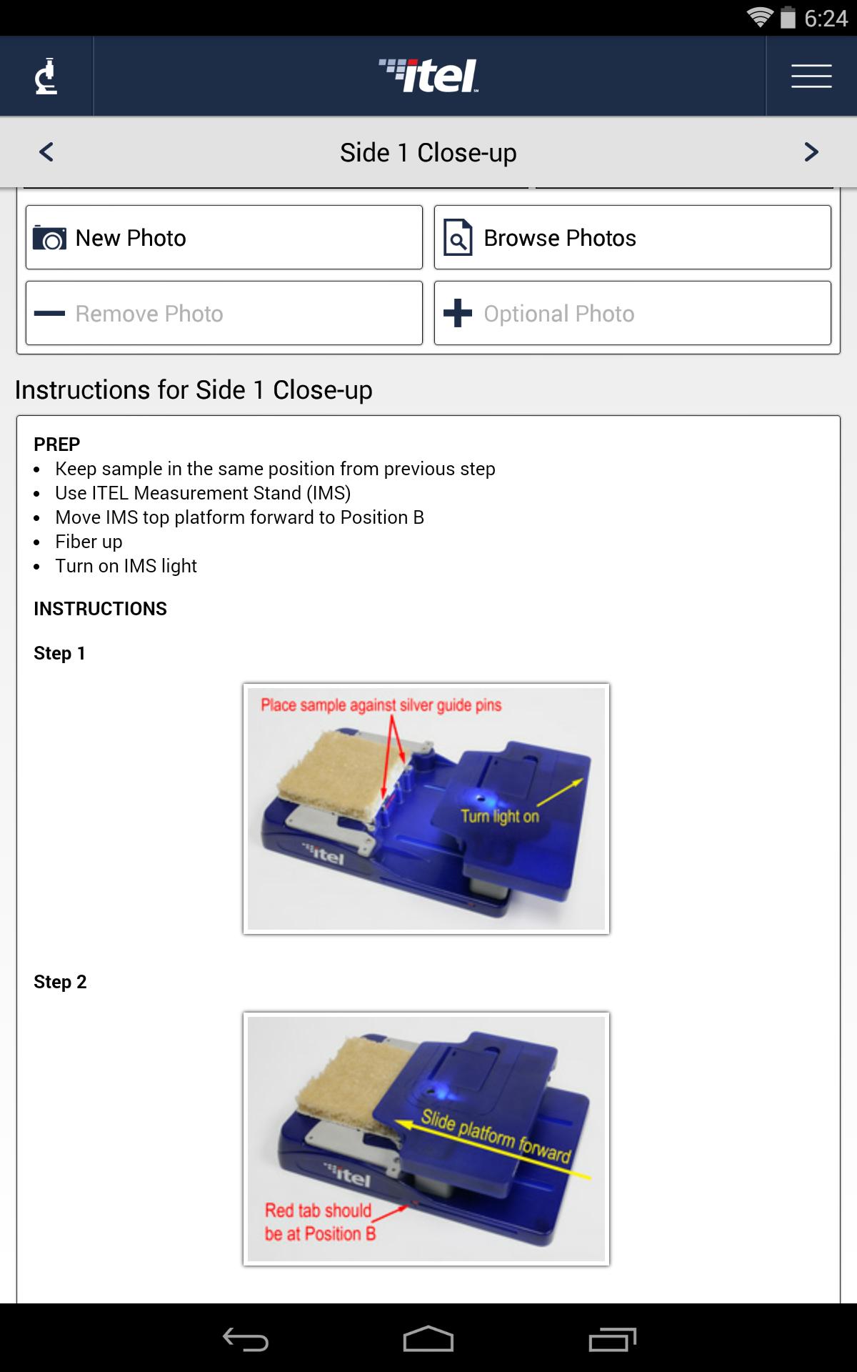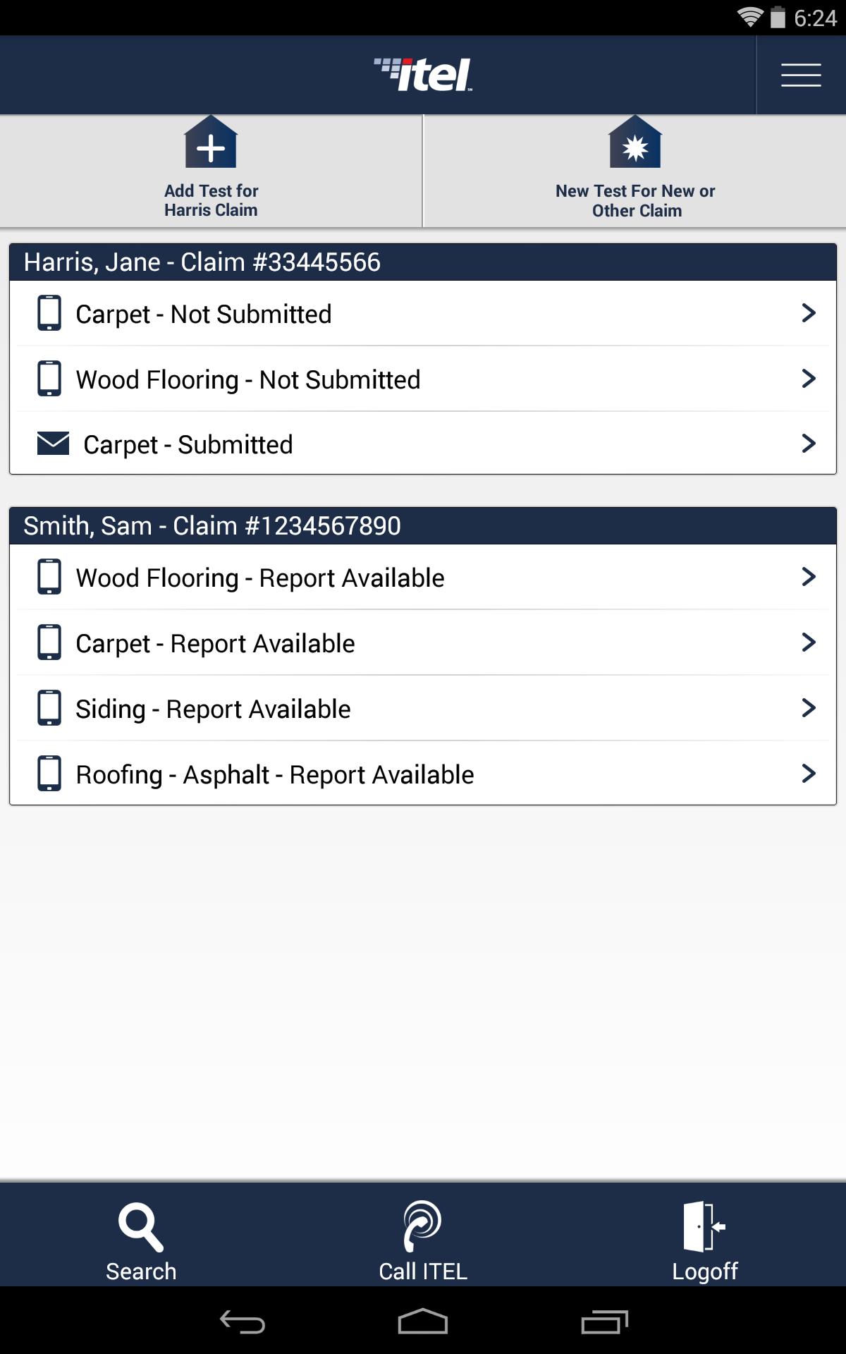 Приложение ITEL направляет вас через необходимые фотографии и измерения для загрузки в нашу лабораторию, где каждый тест выполняется аналитиком ITEL . Приложение поддерживает напольные покрытия, сайдинг, асфальтовое кровель и коврики (импортированные и домашние):