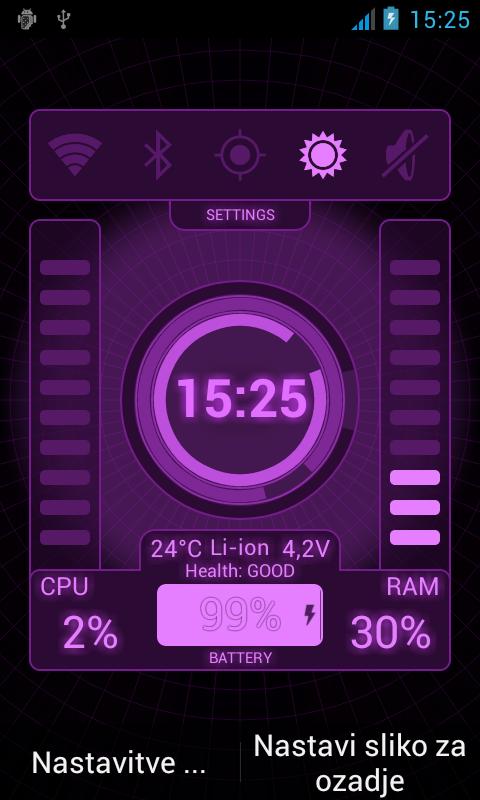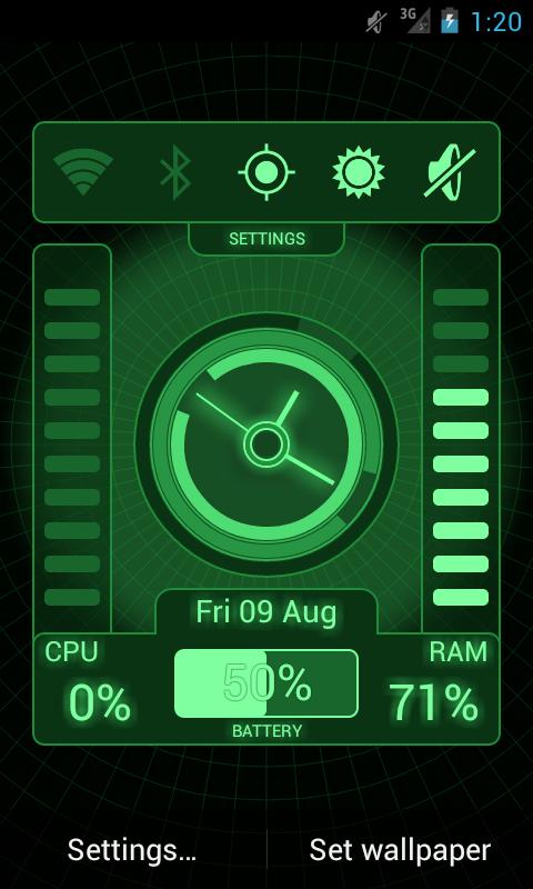 Обои в одном-это живые обои, которые заменяют необходимость в дополнительных виджетах. Он отображает текущее время, дату, информацию о батареи, использование ЦП и оперативной памяти, информацию о хранении и предлагает возможность включить или отключить Wi-Fi, Bluetooth, GPS, тихий режим, режим вибрации и установить яркость экрана. Измените цвета и настройте его в соответствии с вашими потребностями.
