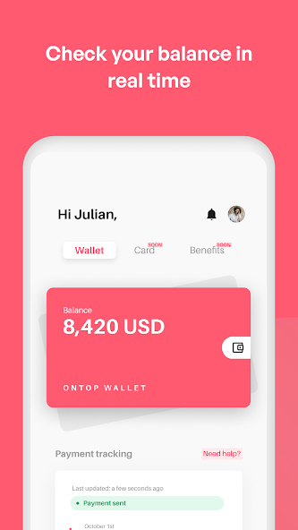 Получите полный контроль над вашими зарплатами с несколькими кранами. Ontop позволяет вам получать вашу зарплату, независимо от того, где вы находитесь в мире, отправляйте ее на несколько учетных записей или просто тратите на нашу карту.