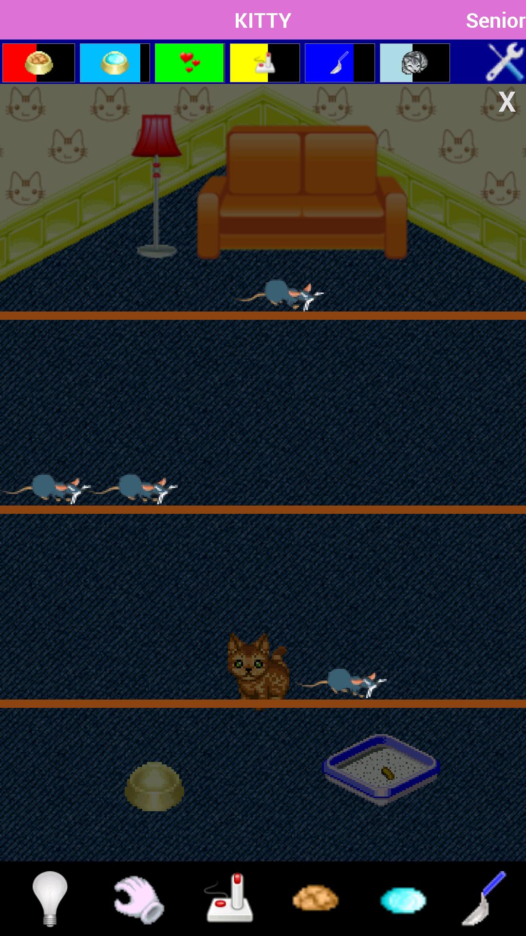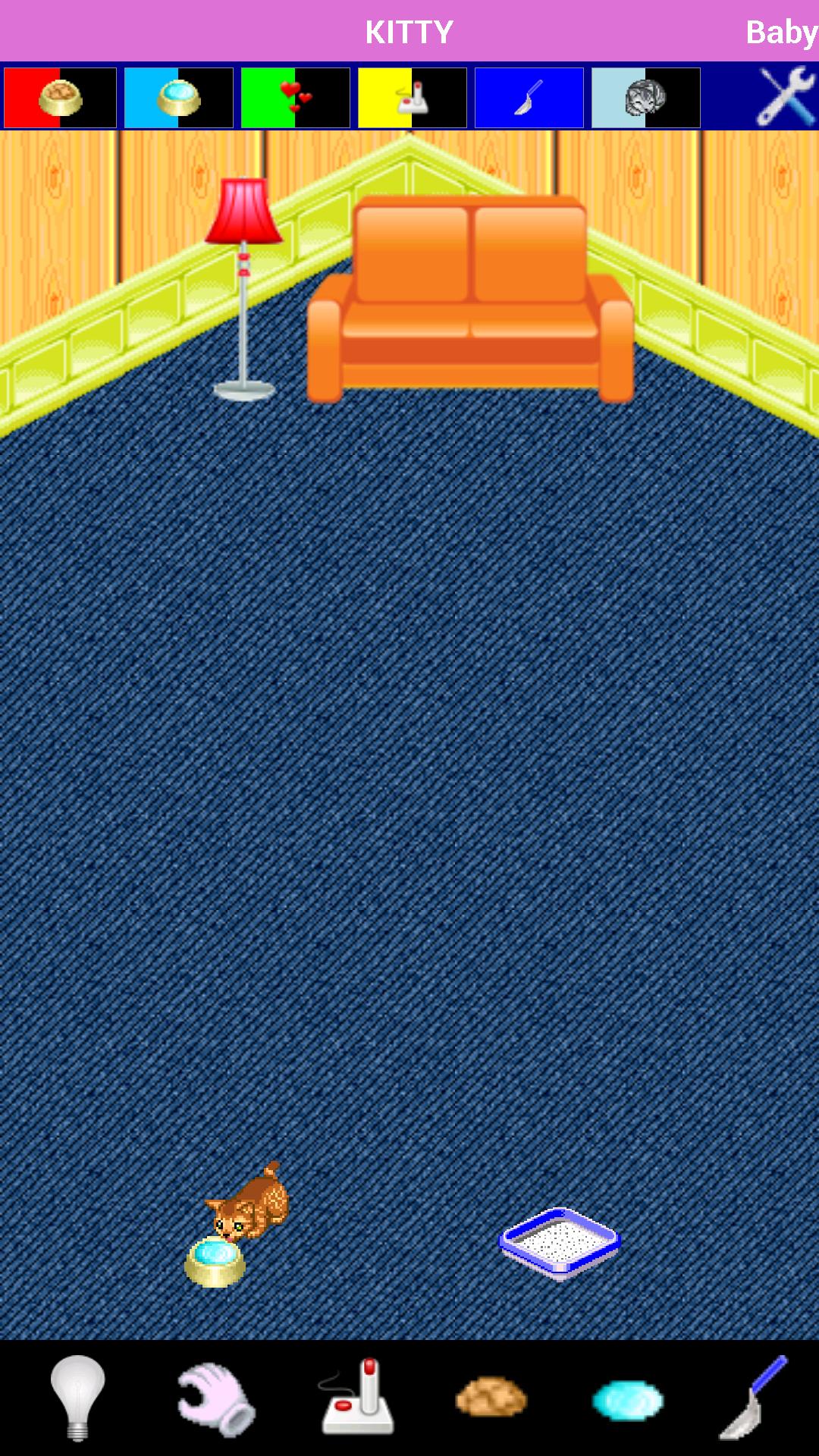 - Лампа: нажмите на него, чтобы отправить виртуального питомца спать или разбудить его. Чтобы загрузить планку усталости поместите вашу кошку в состояние сна.