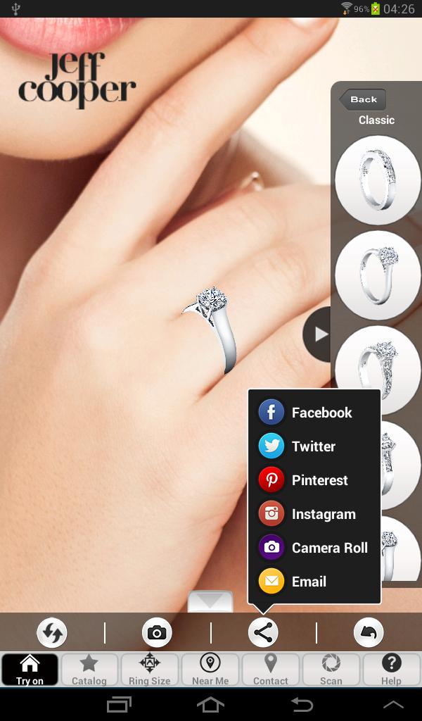 แอปพลิเคชั่น Try-On เสมือน Jeff Cooper โดย Augmente Tech Studio เป็นเครื่องมือที่สนุกและง่ายดายที่ช่วยให้ใช้ "ลองใช้" แหวนทุกวงในแคตตาล็อก Jeff Cooper ค้นหาผู้ค้าปลีก Jeff Cooper ที่ได้รับการรับรองใกล้ที่สุด ด้วยแอพ Try-On เสมือนจริงของ Jeff Cooper คุณสามารถเห็นตัวเองในวงแหวนในฝันของคุณ ... อย่างแท้จริง