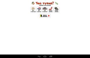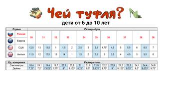 ภาคผนวก "รองเท้าใคร?" จะเปรียบเทียบขนาดรองเท้าทำเครื่องหมายต่างประเทศกับขนาดภาษารัสเซีย รวมถึงขนาดสำหรับผู้ชายผู้หญิงและรองเท้าเด็ก (รวมถึงทารกแรกเกิด)