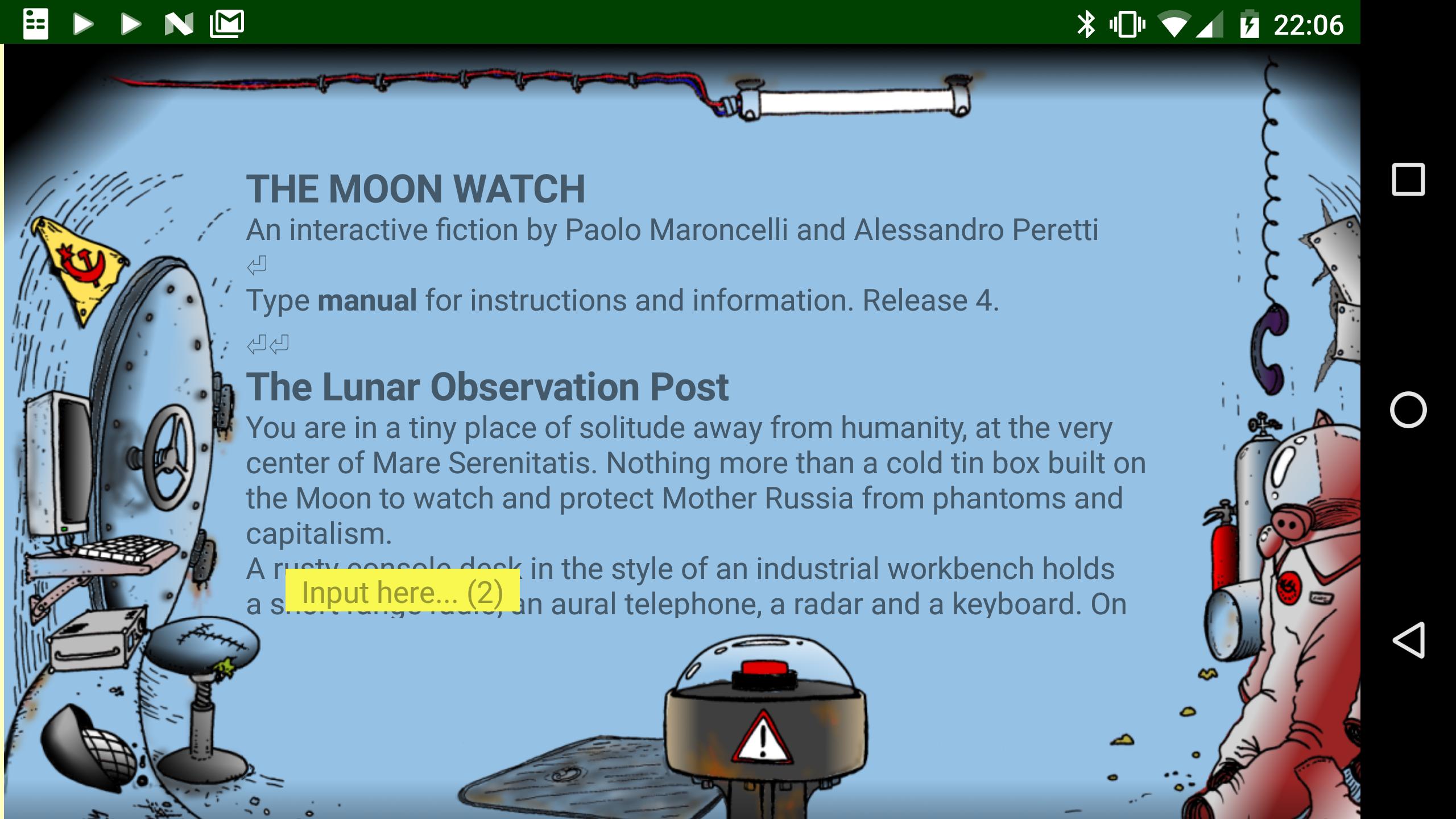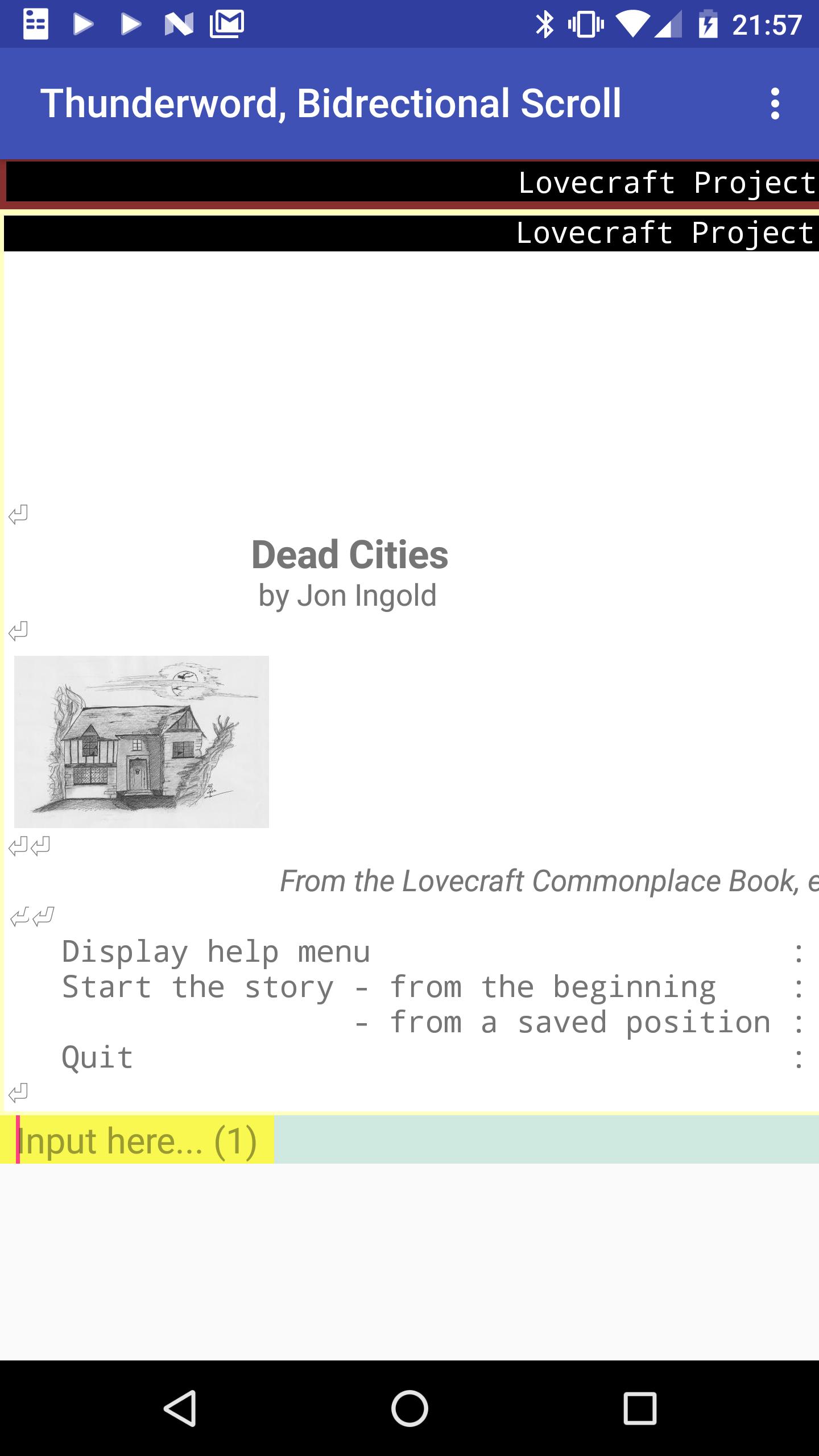 เครื่องยนต์นิยายอินเทอร์แอคทีฟสำหรับ Z-Machine, Glulx และเรื่องราว GLK อื่น ๆ รวมเครื่องยนต์ล่าม Git และ Glulxe เช่นเดียวกับล่าม Z-Code (Bocfel. Frotz, Nitfol) และอื่น ๆ (Scott, Tads, Level9) JSON สามารถแลกเปลี่ยนกับแอพ Android อื่น ๆ สำหรับทั้งอินพุตและเอาต์พุตผ่านโปรโตคอล REMGLK ซึ่งรวมถึง Thunderword ที่ไม่มีหัวซึ่งแอพรองสามารถควบคุมได้อย่างสมบูรณ์ผ่านหน้าจอและเค้าโครงแป้นพิมพ์และการนำเสนอ