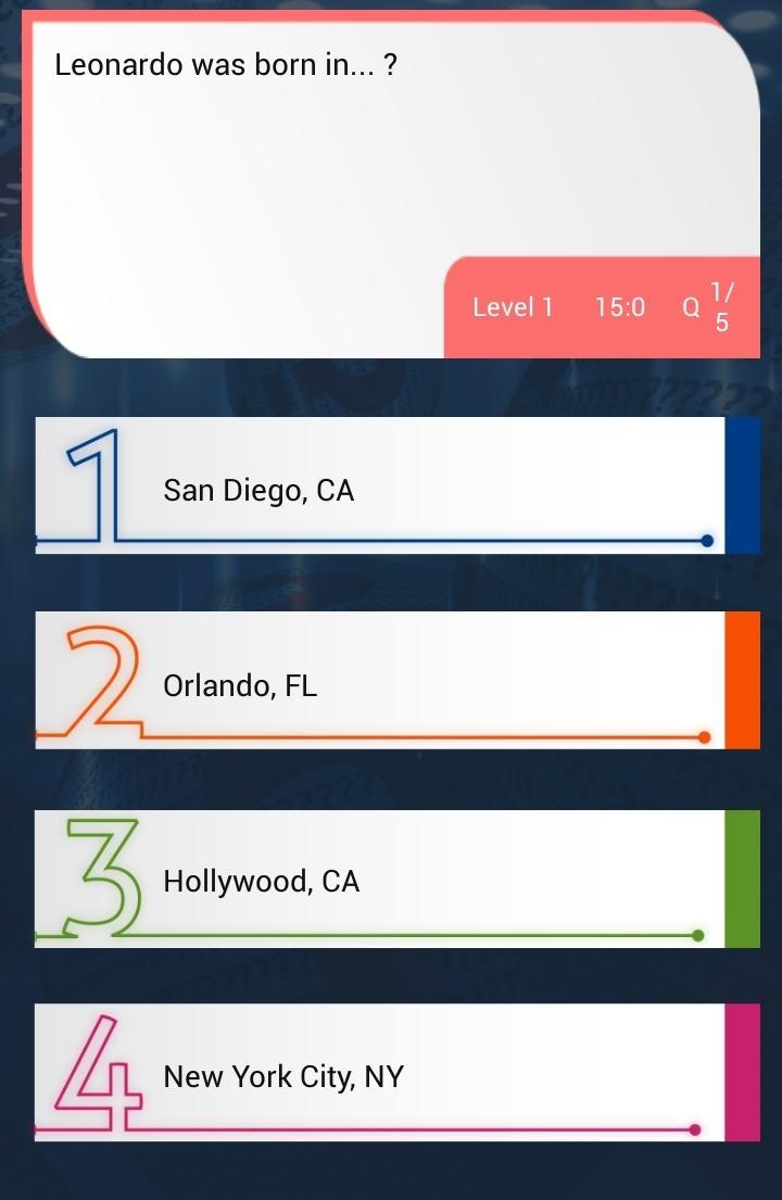 นี่เป็นเกมตอบคำถามที่สนุกที่คุณตอบคำถามที่เกี่ยวข้องกับ Leonardo DiCaprio เกม Quiz ของ Leonardo DiCaprio มีระดับที่แตกต่างกันแต่ละระดับมีคำถามที่น่าสนใจมากมายเกี่ยวกับ Leonardo DiCaprio ที่คุณต้องการเพื่อให้บรรลุเกณฑ์ที่จำเป็นในการปลดล็อกระดับ Leonardo DiCaprio Trivia นั้นน่าสนใจรวดเร็วและใช้งานง่าย