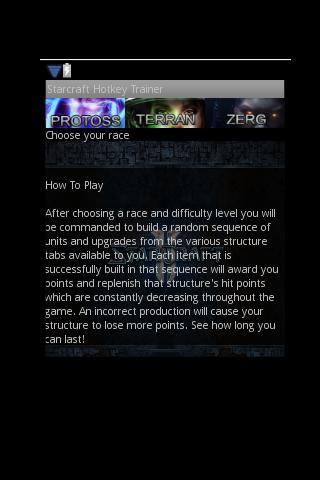 วิธีที่ดีที่สุดในการจดจำคีย์ลัดคือการกด แอพนี้นำความรู้ของคุณไปสู่การทดสอบโดยนำเสนอรายการแบบสุ่มของรายการเพื่อสร้างจากแท็บโครงสร้างต่าง ๆ จำลองการผลิตหน่วยในเกม Starcraft จริง! แอพนี้ยอดเยี่ยมถ้าคุณกำลังเรียนรู้การแข่งขันใหม่หรือถ้าคุณยังใหม่กับเกมและยังคงดิ้นรนที่จะจำไว้ว่าฮอตคีย์สำหรับอาวุธพื้นดินคือ 'G'!