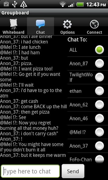 易於使用 - 只需啟動應用程序,然後通過拖動手指在屏幕上繪製。用兩個手指(捏手勢)放大或滾動並滾動。單擊“連接”選項卡以與他人連接。