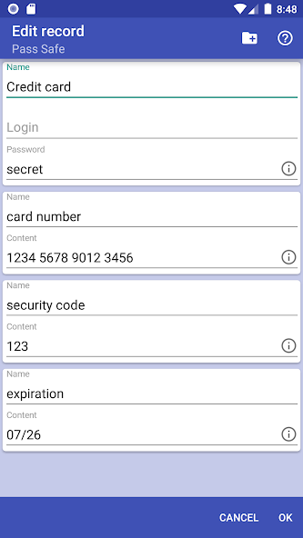 很難記住您的所有密碼,用戶名,帳戶,帳號,客戶ID,安全代碼,標識符,引腳嗎? Pass Safe可用於存儲所有密碼,用戶名,帳戶等。您需要知道的所有訪問都是一個主密碼。您的數據僅在設備上存儲了加密(AES-256 Cypher)。
