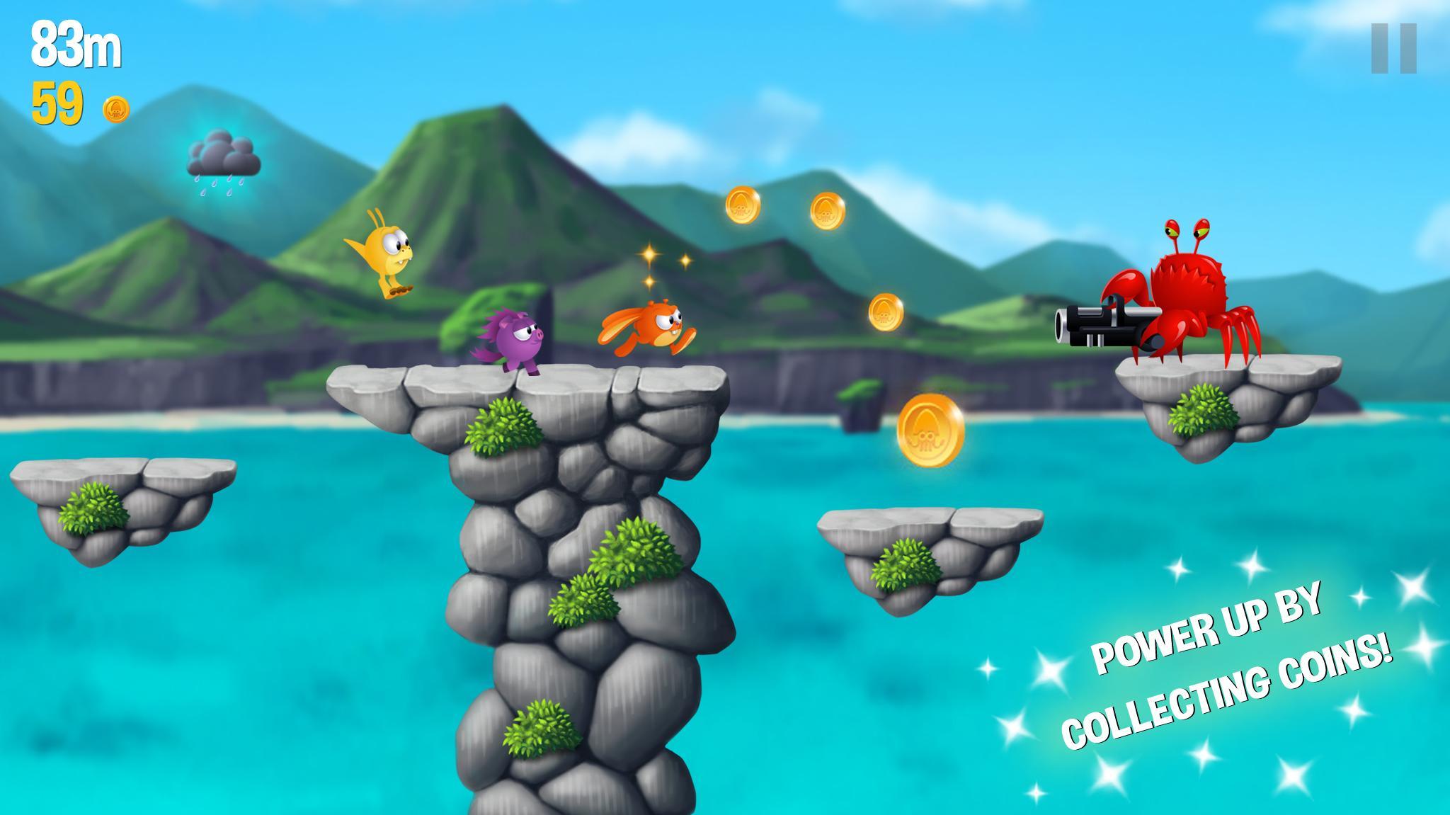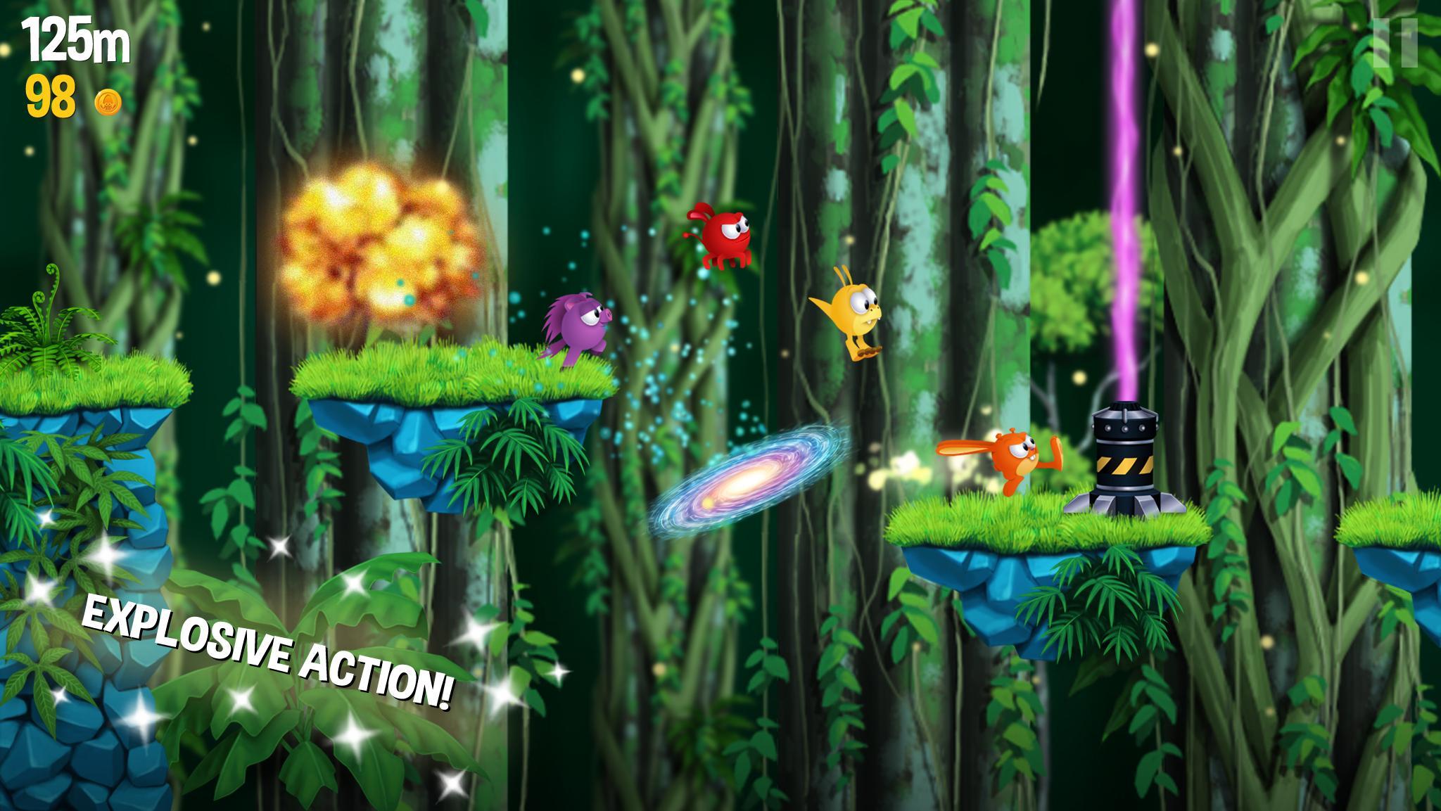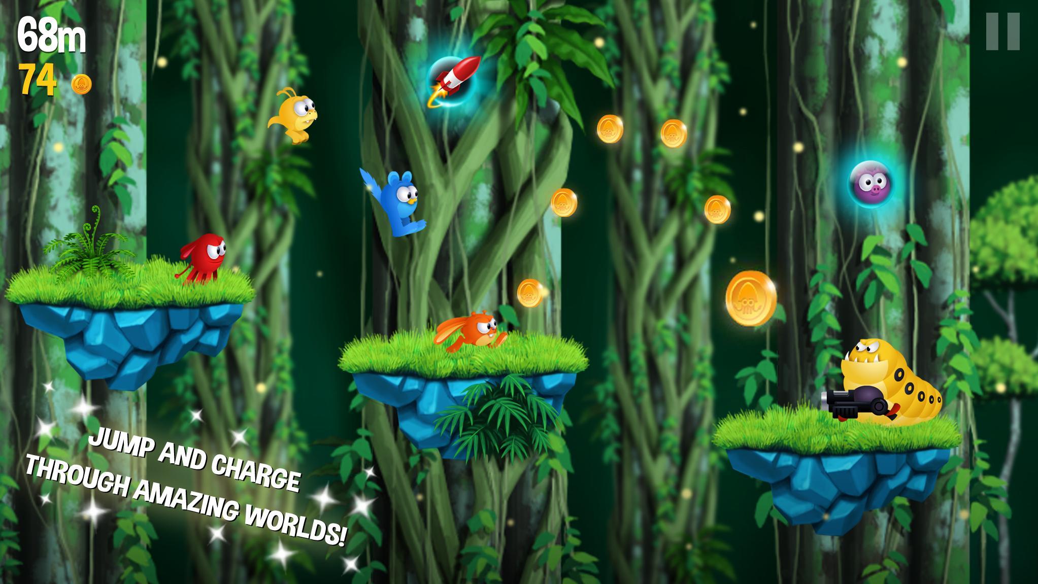 這是一個跑步,跳躍,充電遊戲,但您並不孤單。通過遊戲的進步使玩家可以沿途拯救他們的伙伴,他們成為部隊的一部分並在比賽中幫助他們。夥伴也充當額外的生活。每次愚蠢的人掉出來時,下一個夥伴都會接管領導者。