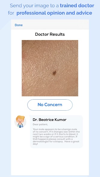 scanoma允許您更多地了解潛在的皮膚問題,並從皮膚科醫生那裡獲得反饋。只需拍攝痣的圖片,然後與皮膚科醫生分享以進行專家審查。