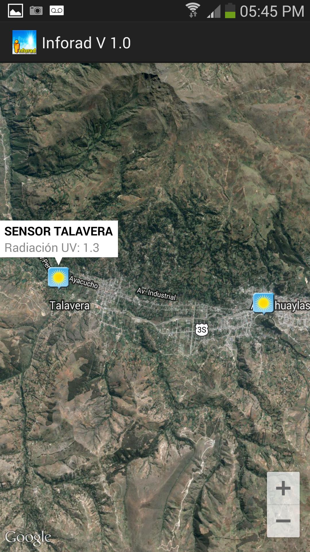 顯示位於Andahuaylas市的UV -B兩個傳感器的當前速率 - 秘魯,此信息每五分鐘進行一次更新,並允許將人進行地理位置到最近的傳感器。