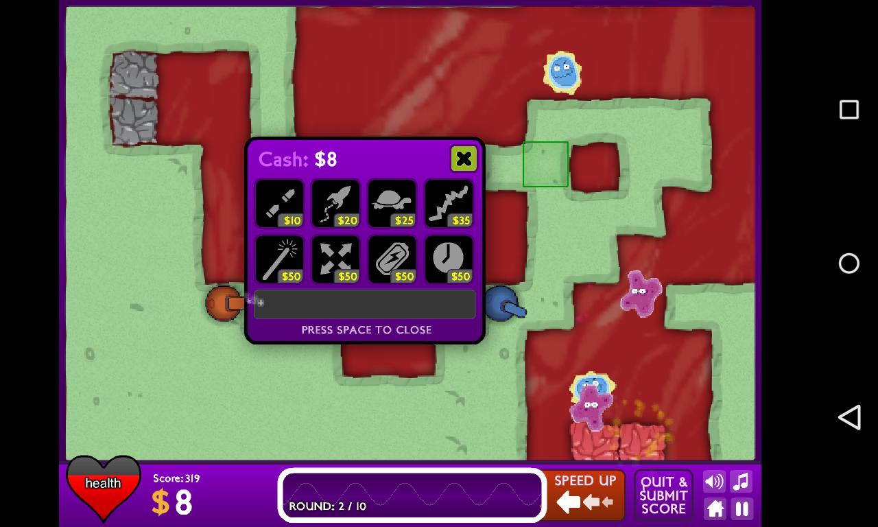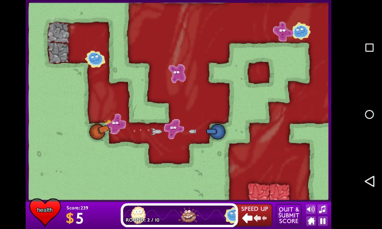因此,您可以選擇不同的路線,需要在通往基地的途中停止病毒。互動界面和開朗的音樂將吸引您追逐微生物。在遊戲中獲得更多積累的信貸,這將幫助您購買更多的進攻塔。加快殺戮以獲得更多獎勵積分!