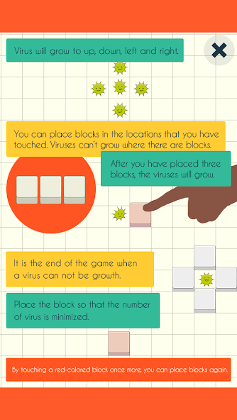 您可以在觸摸的位置放置塊。病毒無法在存在塊的地方生長。放置三個區塊後,病毒將會生長。這是遊戲的結尾,病毒無法生長。放置區塊,以使病毒數量最小化。