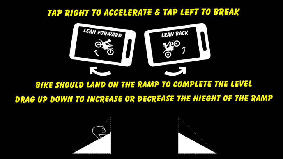 這個遊戲具有非常獨特和有趣的想法。通過向下拖動手指,將坡道放在您所需的高度上。加速自行車,盡可能跳高,然後將其標記為標誌。當您的自行車在空中時,您可以迅速將設備傾斜的時間很多。