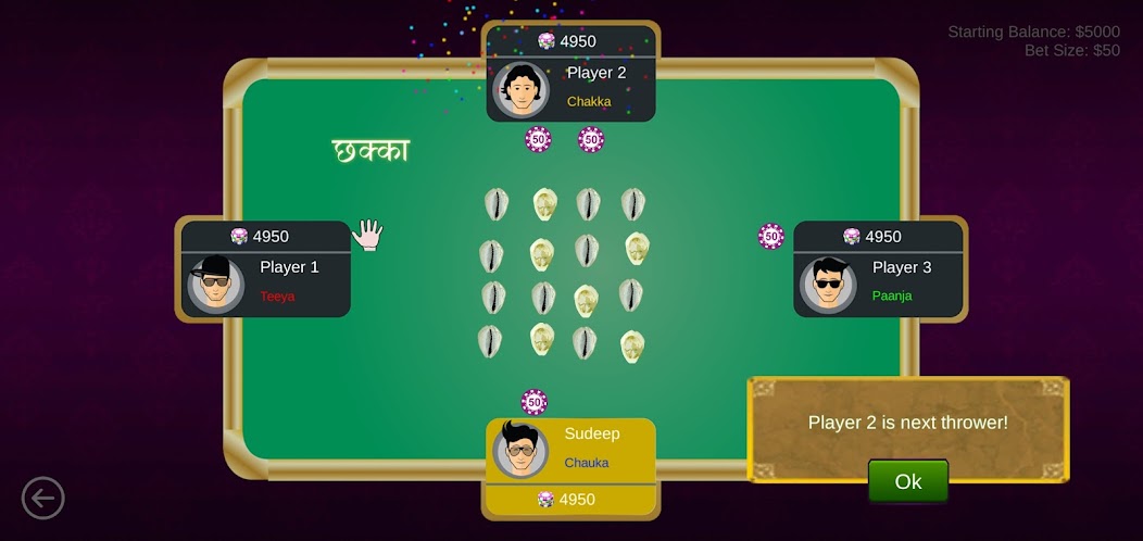 當Teeya投擲砲彈時,如果發生Teeya,他將所有在Chauka,Paanja和Chakka的下注。如果發生其他事件,則Teeya必須將BET的兩倍支付給發生。當Teeya投擲時,如果發生的是Teeya,他再次拋出了砲彈,但是如果發生的事件是其他事件,那麼投擲的轉彎就會傳給他,這種方式將繼續進行遊戲。